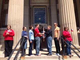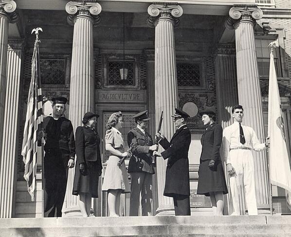 A team from CALS Academic Affairs relived history last week as part of the CALS Week Scavenger Hunt. Among the items on the hunt list was to recreate the historic photo below. Pictured (L to R): Cindy Fendrick, Andrea Sottile, Megan O’Rourke, Dan Barnish, Sue Ryan, Sam Loveland (CALS senior), Karen Martins