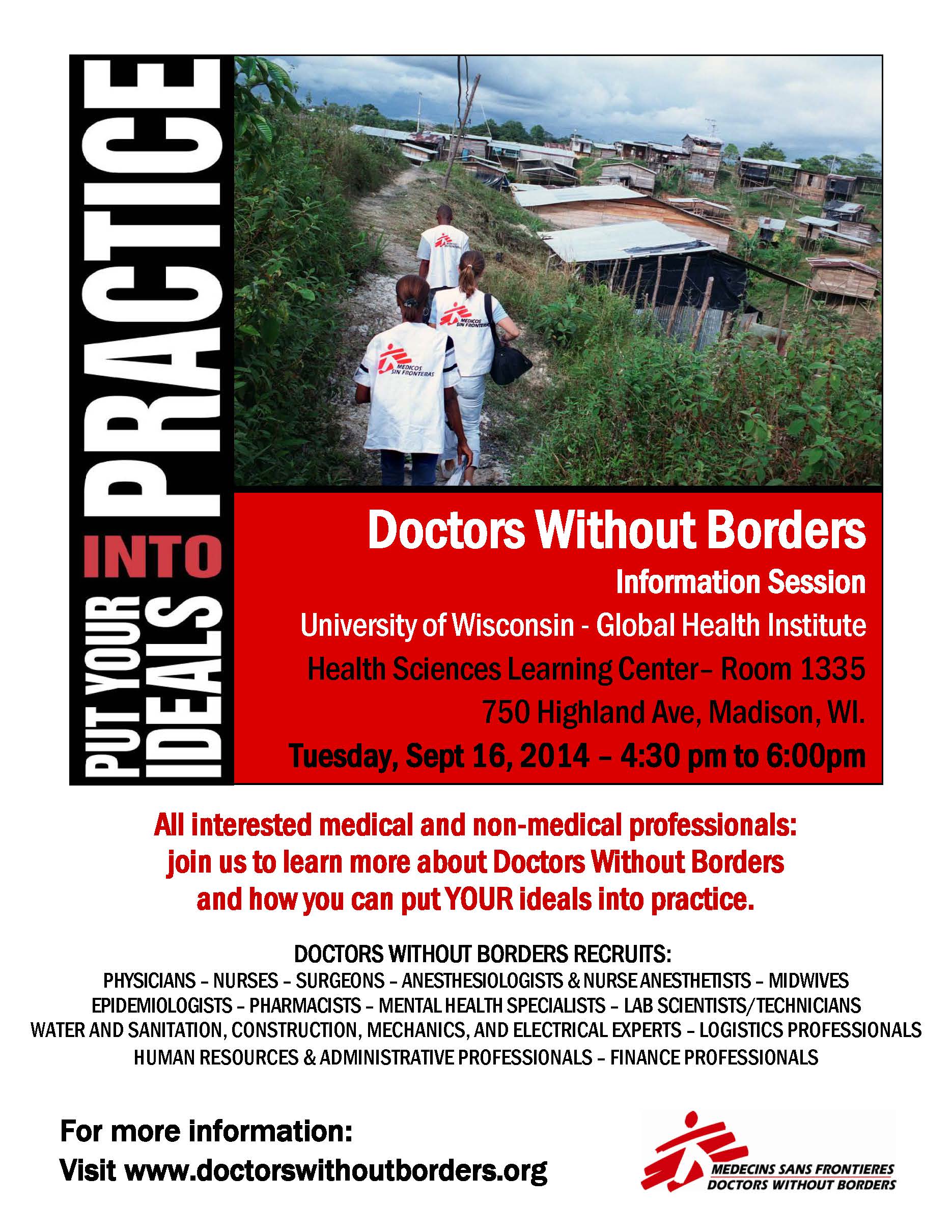 The organization Doctors Without Borders will be offering an information session this coming Tuesday, September 16, 4:30-6:00pm in room 1335 of the Health Sciences Learning Center. Please see the attached flyer for more information, and feel free to post in your departments and share with your colleagues. No registration is required and we hope you can join us!