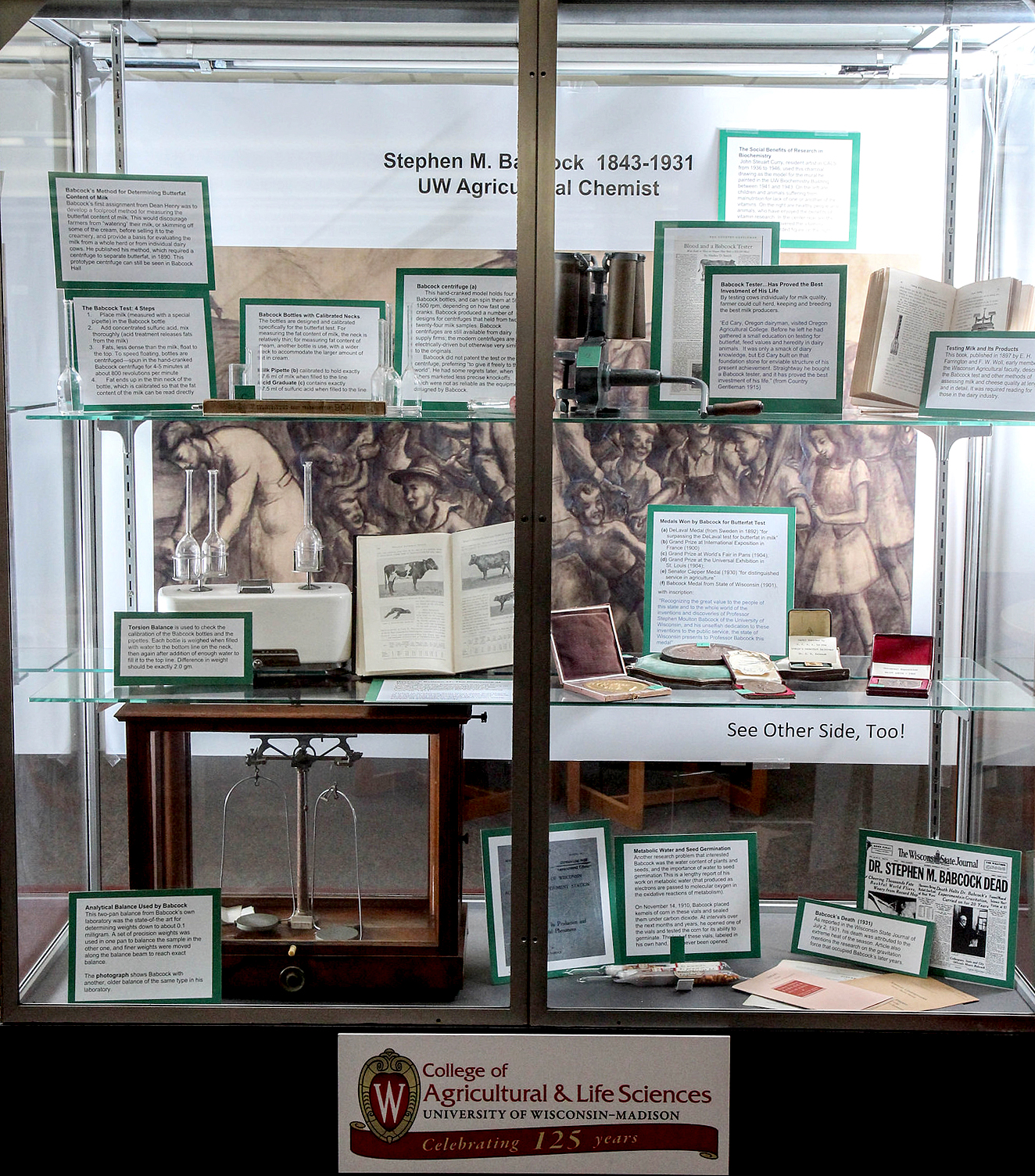 As part of the college’s quasquicentennial (yes, it is still 2014), a historic display has been placed in Steenbock Library. Library staff brought the idea of a display in honor of the 125th anniversary to CALS external relations early in the year, and worked with biochemistry professor emeritus Dave Nelson to develop a plan.