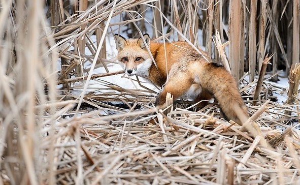 The next morning — a frigid, windy one — crows murmured overhead and a bright, young red fox sat among a thicket of reeds, caught up in his hunt for a snack. The day before, a bald eagle had visited, keeping watch on this area of prime real estate. Tracks in the snow gave away the presence of canids, as did a small pile of scat nearby.