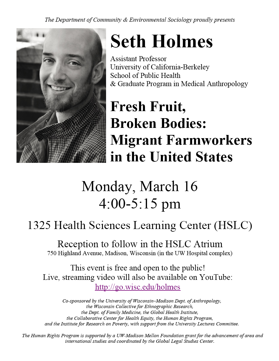 The public is invited to attend an upcoming talk entitled, “Fresh Fruit, Broken Bodies: Migrant Farmworkers in the United States.” Seth Holmes, assistant professor from UC-Berkeley, will give the talk scheduled for 4:00pm on Monday, March 16 in the Health Sciences Learning Center. The event will also be live-streamed and available on YouTube.