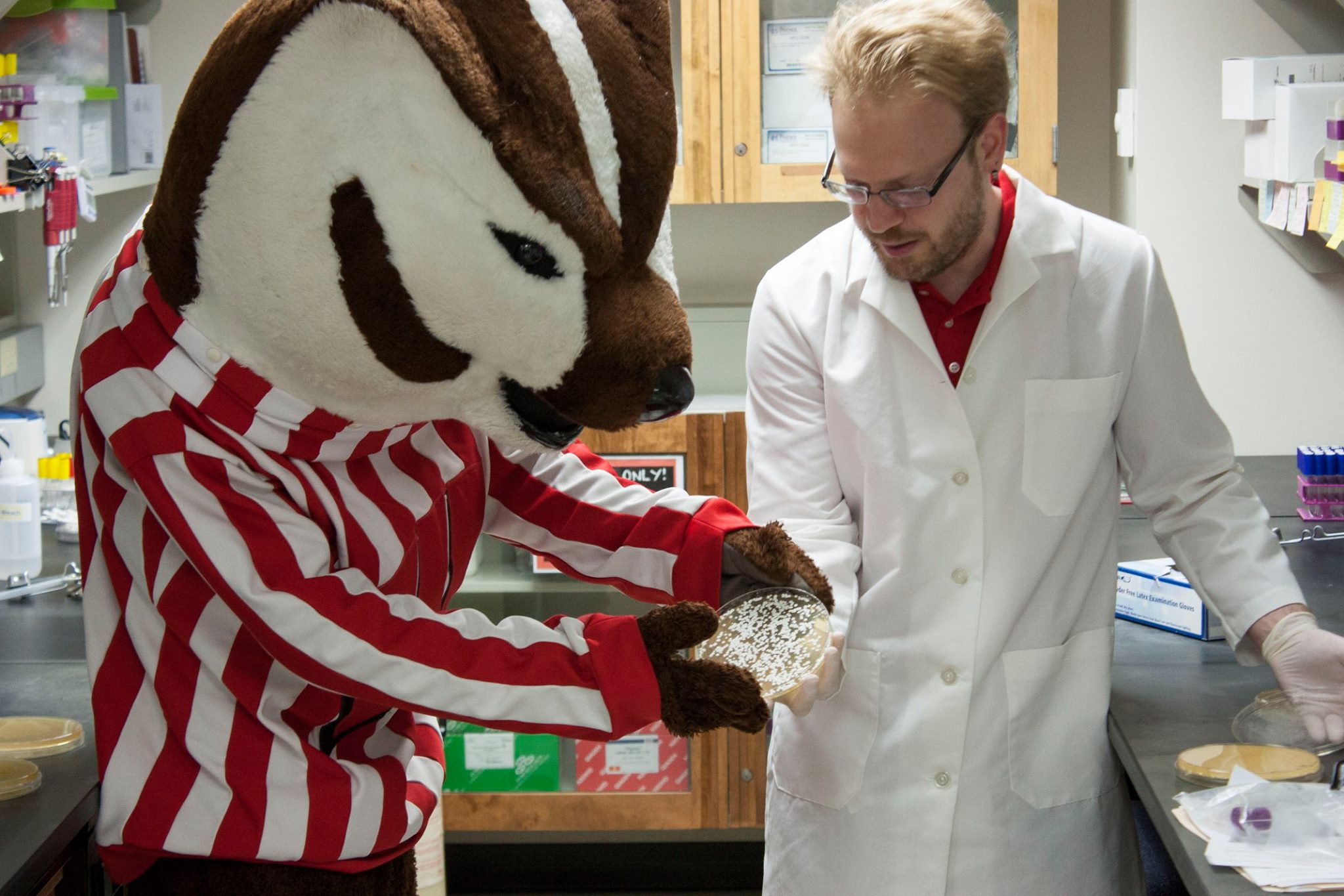Bucky Badger visits Hittinger lab to meet his namesake yeast