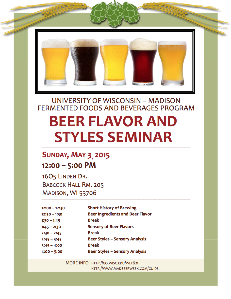 Early next month the Department of Food Science’s Fermented Foods and Beverage Program will host a Beer Flavor and Styles Seminar during Madison Craft Beer Week. The educational short course, which is directed towards enthusiastic amateurs and people in industries allied with brewing, will be held at Babcock Hall on Sunday, May 3 from noon to 5 p.m.