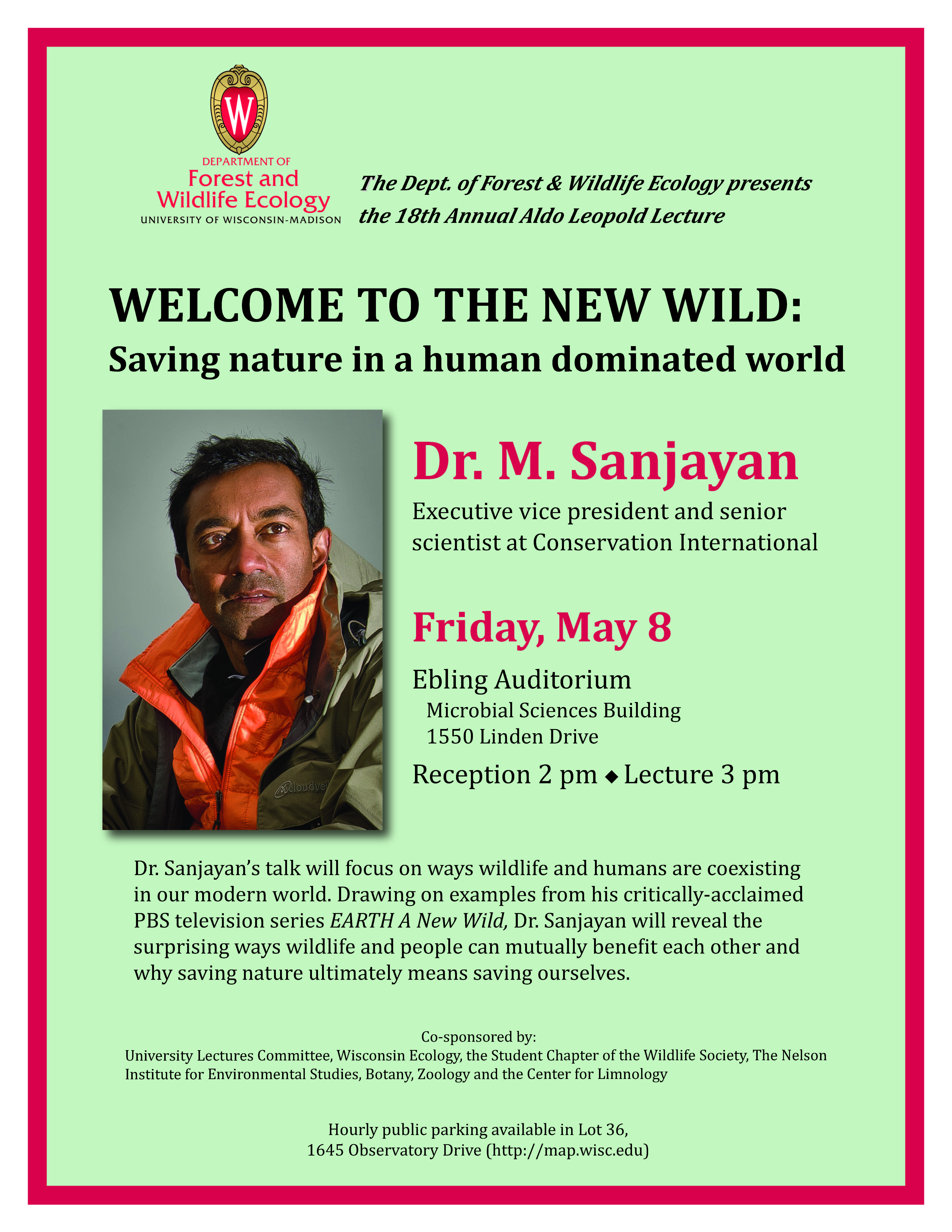 Dr. M. Sanjayan, host of the PBS television series EARTH A New Wild, will visit the UW-Madison campus to present the 18th Annual Aldo Leopold Lecture. In his talk, titled Welcome to the New Wild: Saving Nature in a Human Dominated World, Sanjayan will show how wildlife and humans are co-existing in our modern world. He will describe some surprising ways in which wildlife and people can mutually benefit each other and explain why saving nature ultimately means saving ourselves.