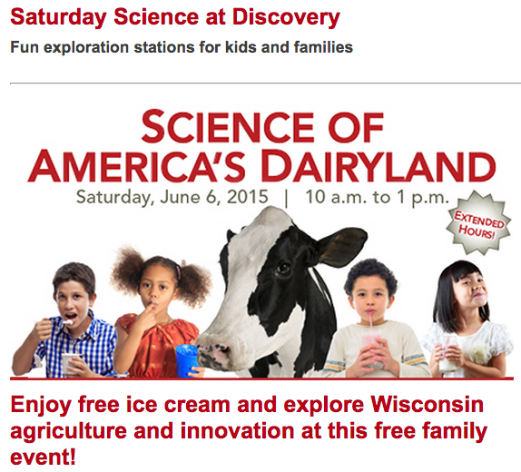 This month’s Saturday Science at Discovery event, billed as the Science of America’s Dairyland, will feature fun, agricultural-themed exploration stations for kids and families. Visitors will also be treated to free ice cream.