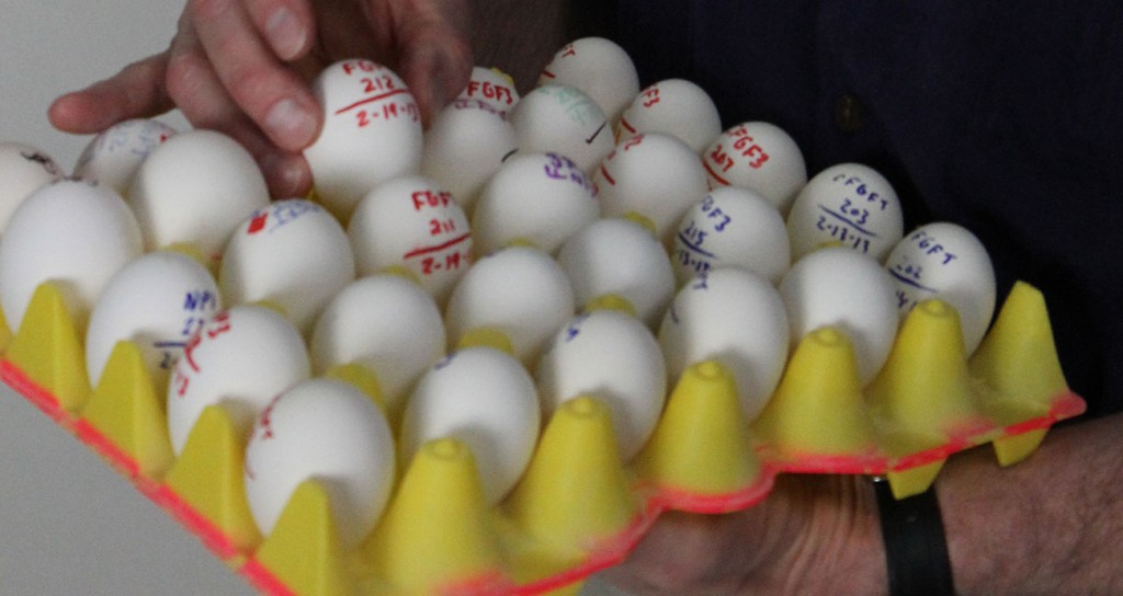 Cook vaccinates laying hens to create antibodies to IL-10. The hens put the antibody in eggs that are then sprayed on the feed of the animals he wants to protect. The antibody neutralizes the IL-10 off-switch in those animals, allowing their immune systems to better fight disease.