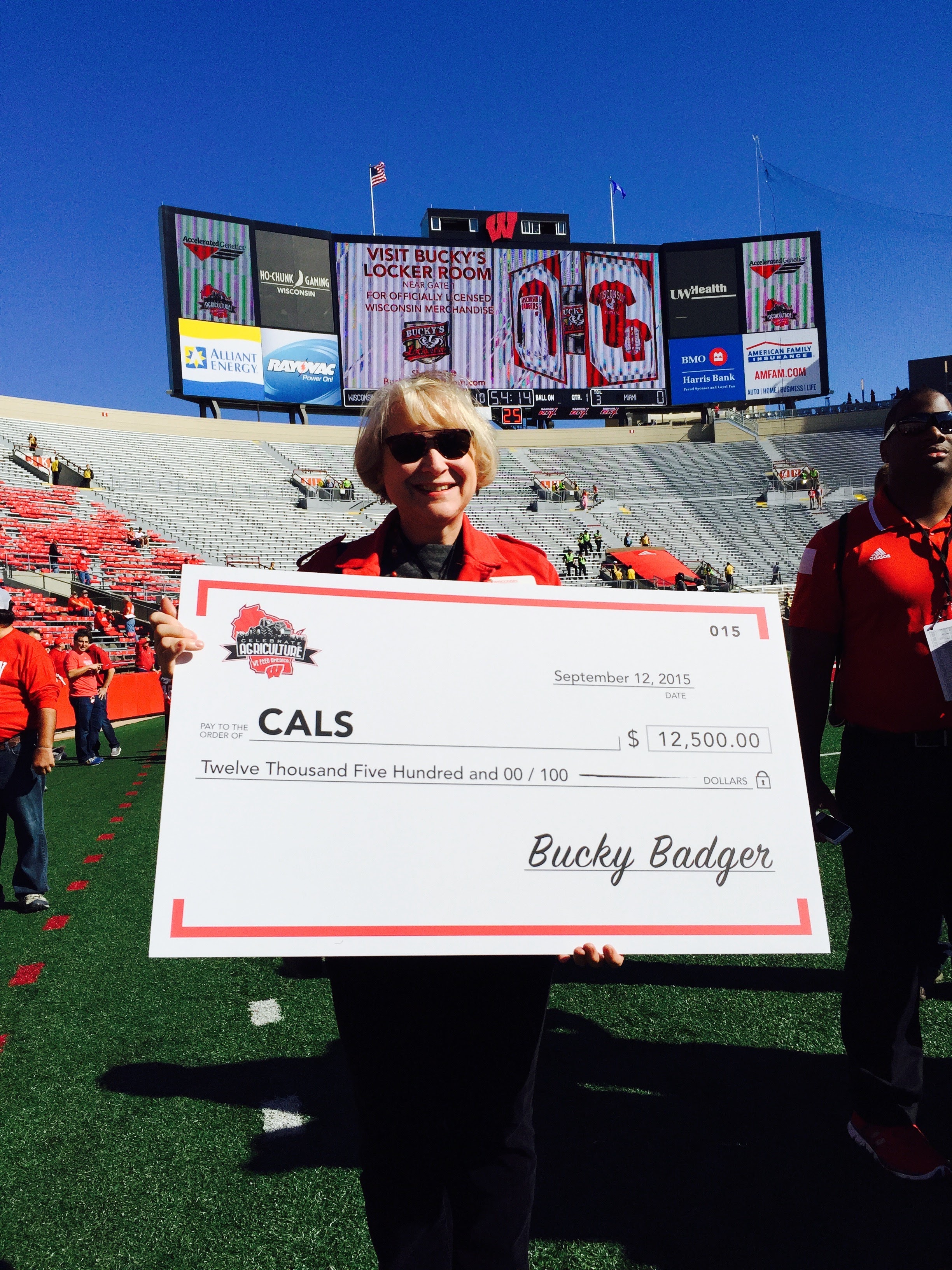 Just as Fire-Up was winding down, the third annual Celebrate Agriculture game was gearing up. Sponsors of the Celebrate Agriculture football game include Accelerated Genetics, Badgerland Financial, Case IH, Cleary Building Corporation, CROPLAN by Winfield, Culver’s, Dairyland Seed, DeLaval and DuPont Pioneer. As part of the special game day celebration, a check for $12,500 was presented to Dean VandenBosch before kickoff.