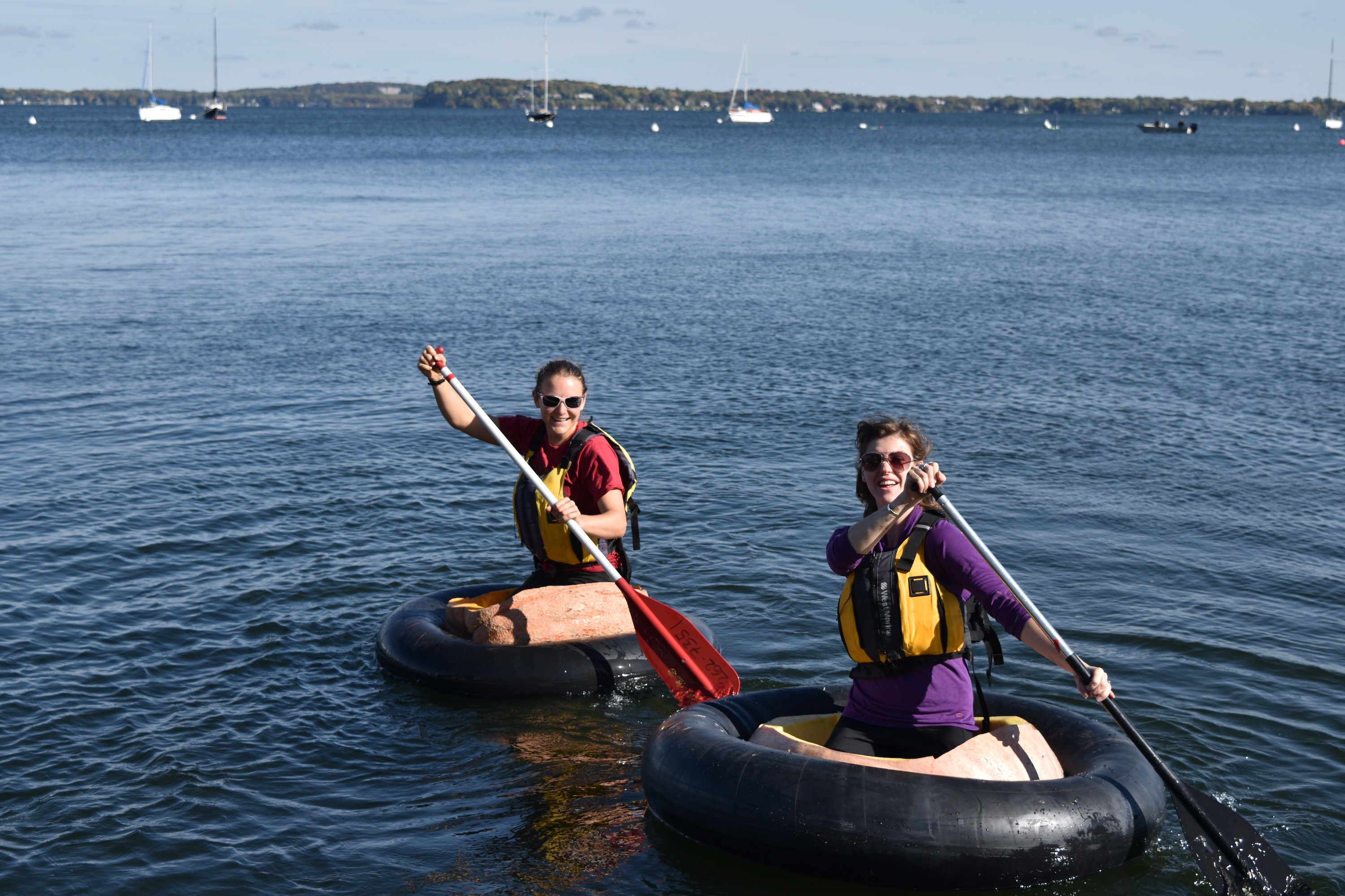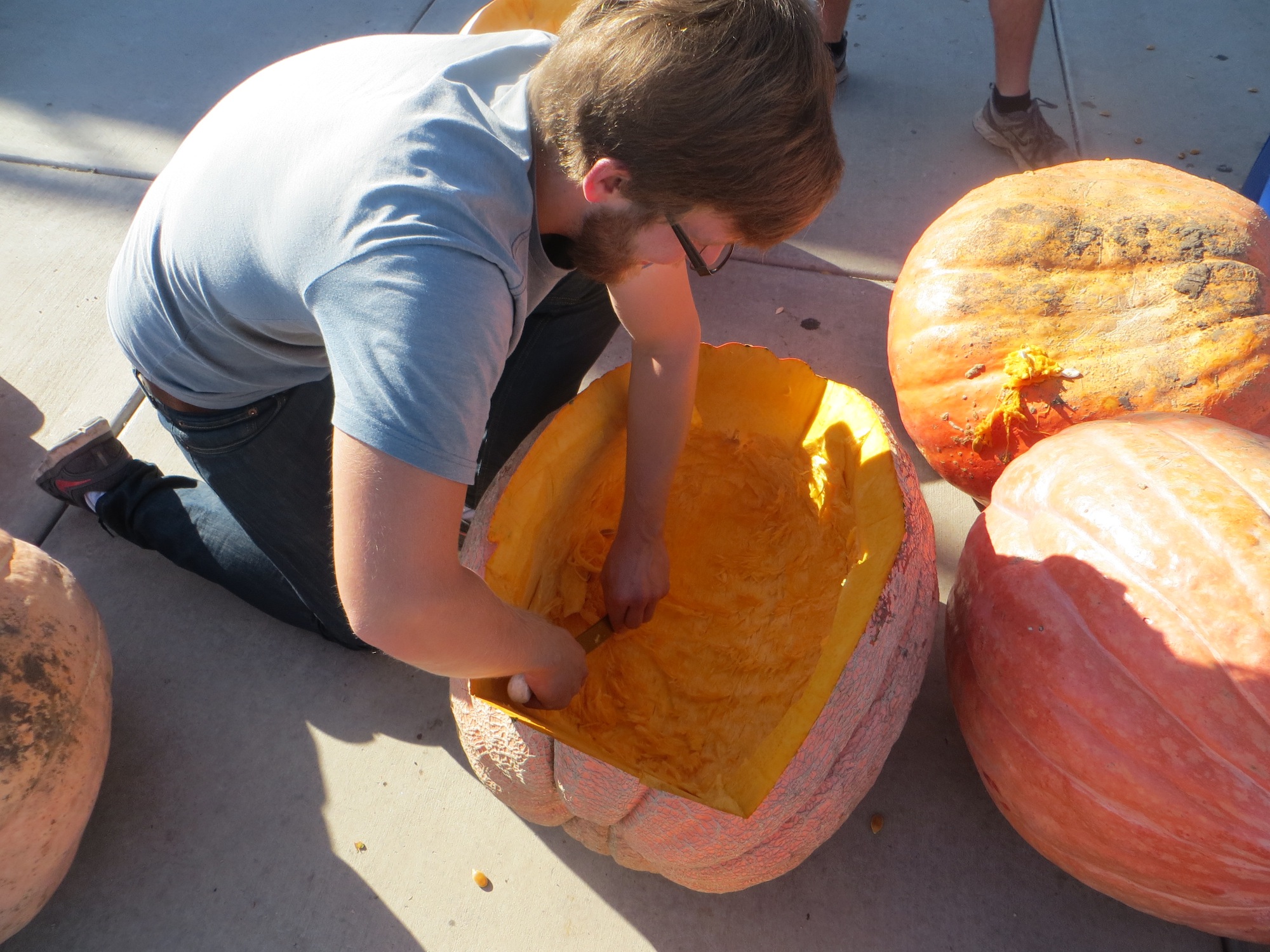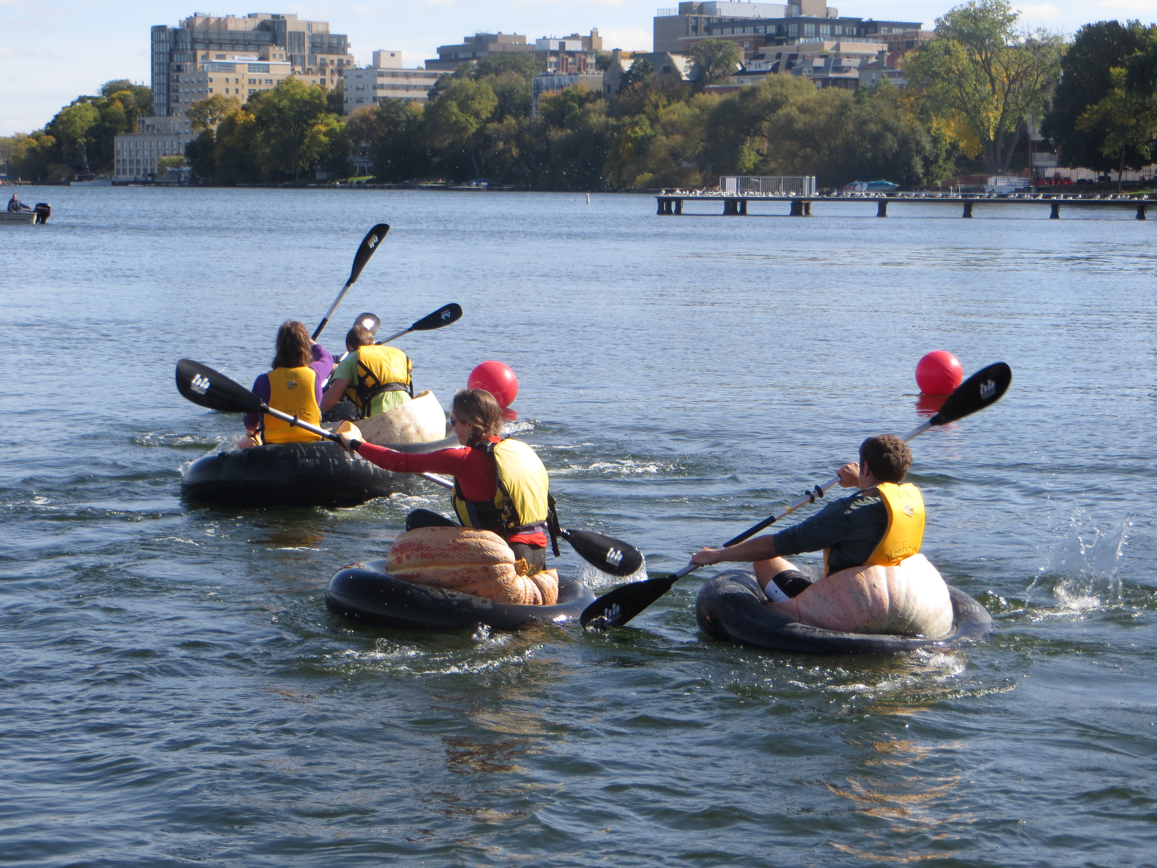 The university’s Giant Pumpkin Regatta took place on Saturday, Oct. 10 at the Memorial Union Terrace. The event featured students racing hollowed-out Atlantic Giant pumpkins rendered buoyant by tractor-tire inner tubes through a course set up by members of UW’s Hoofer Sailing Club. During the growing season, the massive pumpkins were tended by UW students, including Chris D’Angelo and Lynn Maher, graduate students in the lab of Irwin Goldman, professor and chair of horticulture. Check out these photos and read coverage from the race in this Wisconsin State Journal story.