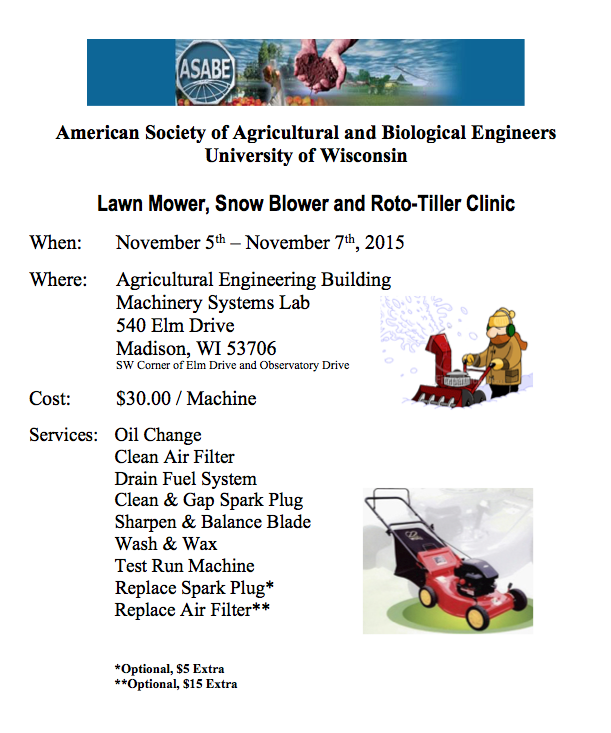 The UW-Madison American Society of Agricultural and Biological Engineers (ASABE) will be holding their annual lawn mower, snow blower and roto-tiller clinic from Thursday, Nov. 5 through Saturday, Nov. 7. This clinic offers a great opportunity to have your mower or roto-tiller winterized and cleaned before storage or to have your snow blower serviced for the upcoming season.Screen Shot 2015-10-15 at 12.14.55 PM