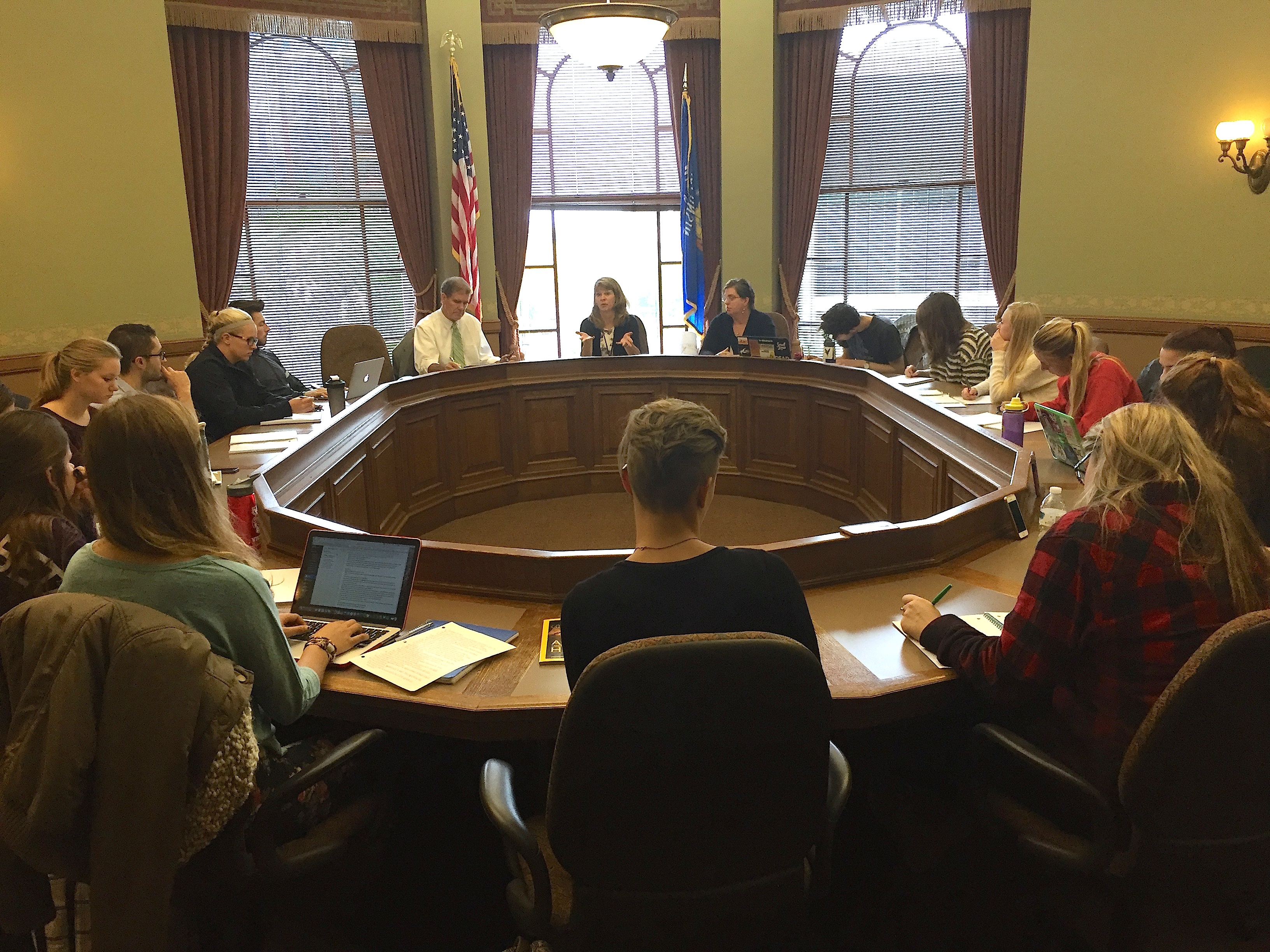 “I just find that real life professional experiences expose the students to the broader world,” said Flaherty, whose numerous professional connections made the mock press conference with state experts at the Capitol possible. “This is what it looks like from the reporters’ eyes. It’s great to help them understand how to translate technical language into a story a broader audience can understand.”