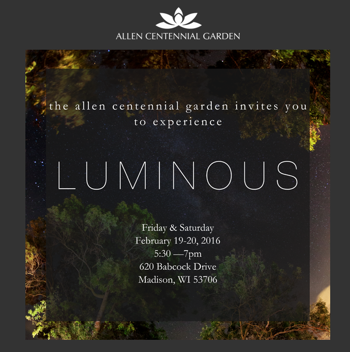 Luminous will take place in the Garden on February 19 & 20, 5:30-7pm. Admission is free, and donations are welcome. Warm treats and a toasty bonfire will compliment your experience.