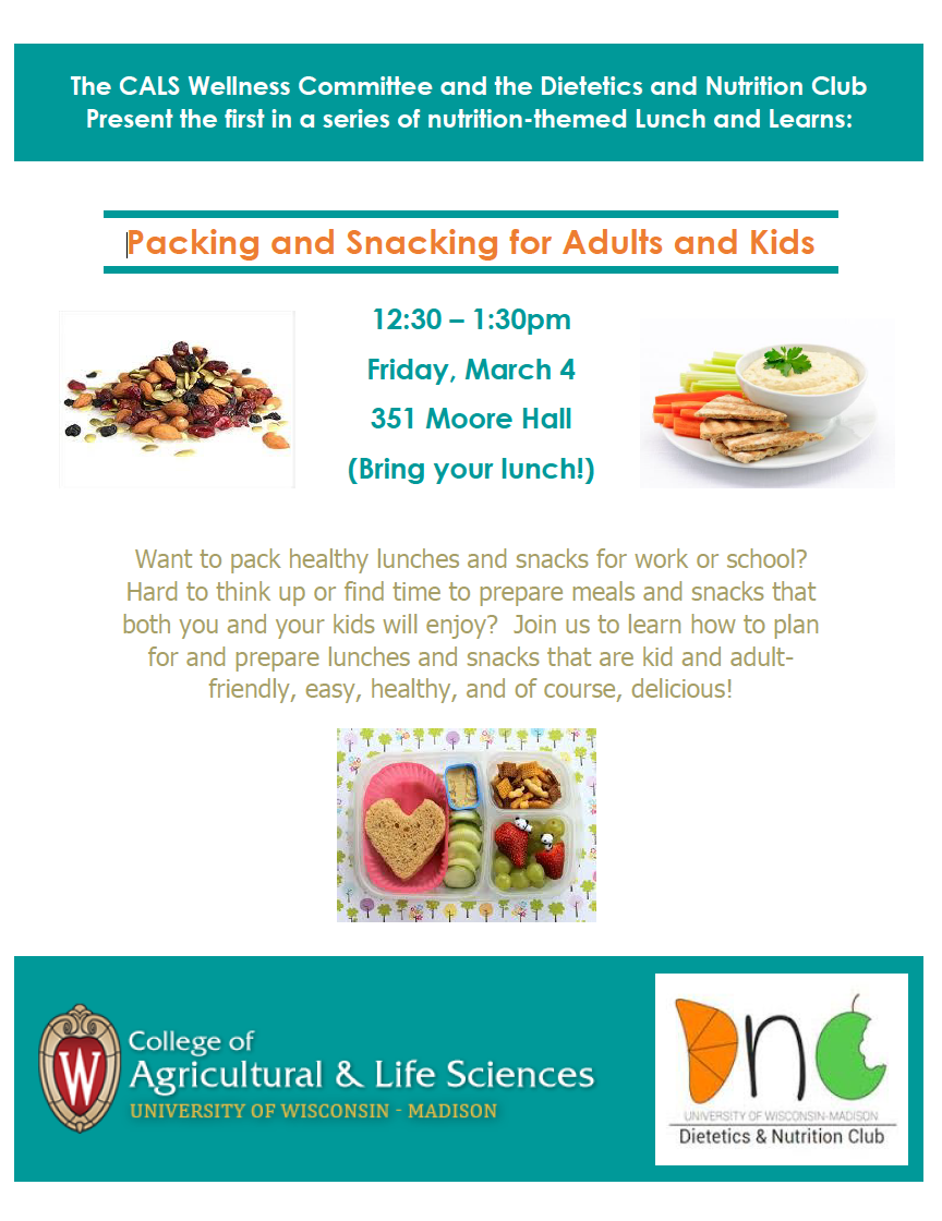 The CALS Wellness Committee and the students of the Dietetics and Nutrition Club present a Nutrition Lunch and Learn series for students, staff and faculty. Bring your lunch and learn about nutrition and wellness tips and tricks on different topics at each session. The first Nutrition Lunch and Learn will be: