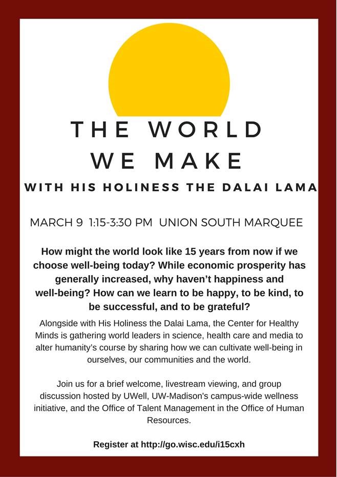 The CALS Wellness Committee would like to alert the CALS community to the opportunity to participate in a livestream viewing the “The World We Make” event in Union South on Wednesday, Mar. 9 featuring the Dalai Lama.