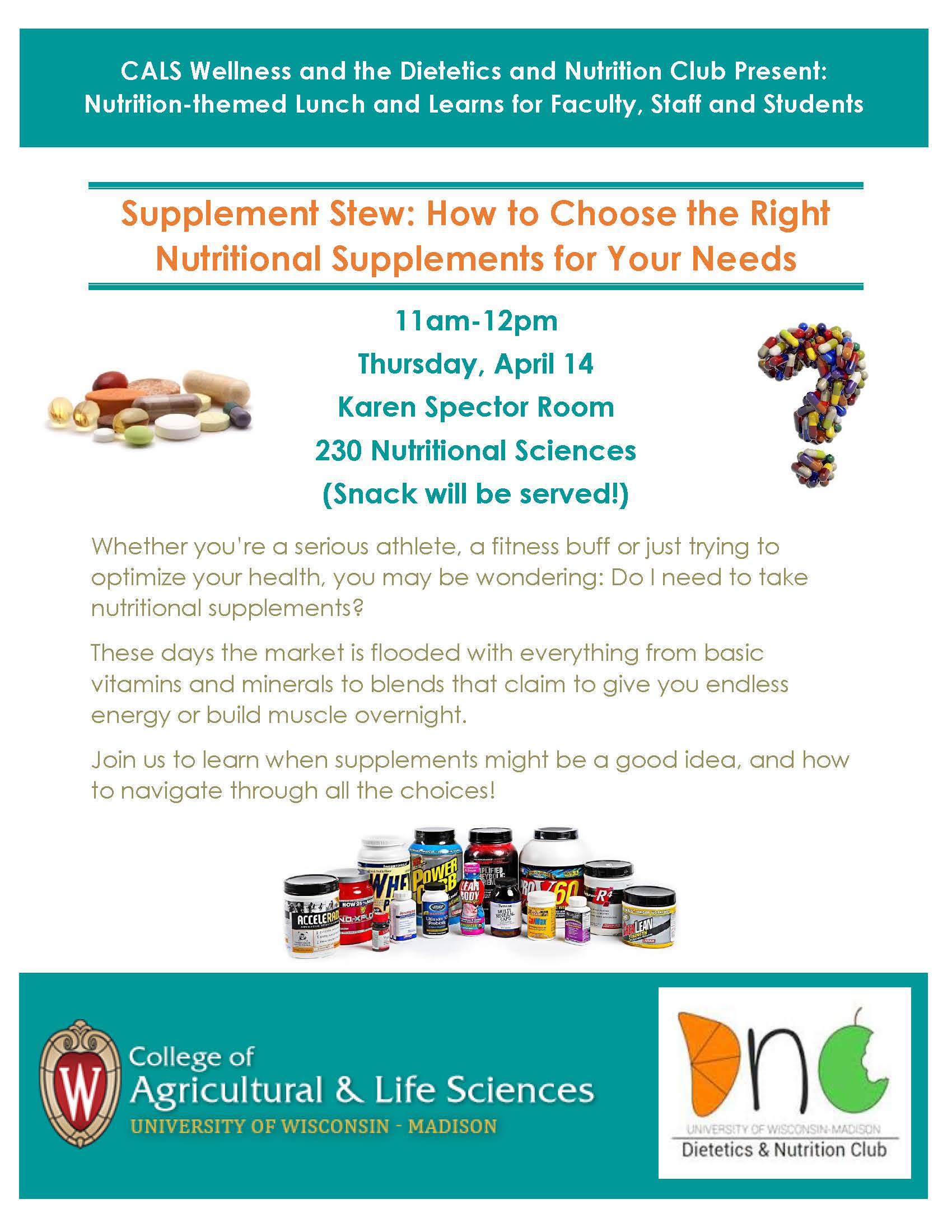The CALS Wellness Committee and the students of the Dietetics and Nutrition Club will host a Nutrition Lunch and Learn on the topic “Supplement Stew: How to Choose the Right Nutritional Supplements for Your Needs” from 11 am – 12 pm on Thursday, April 14 in the Karen Spector Room (room 230) of the Nutritional Sciences Building. Faculty, staff and students are invited to bring their lunch and attend the educational event. (Snacks will also be served.)