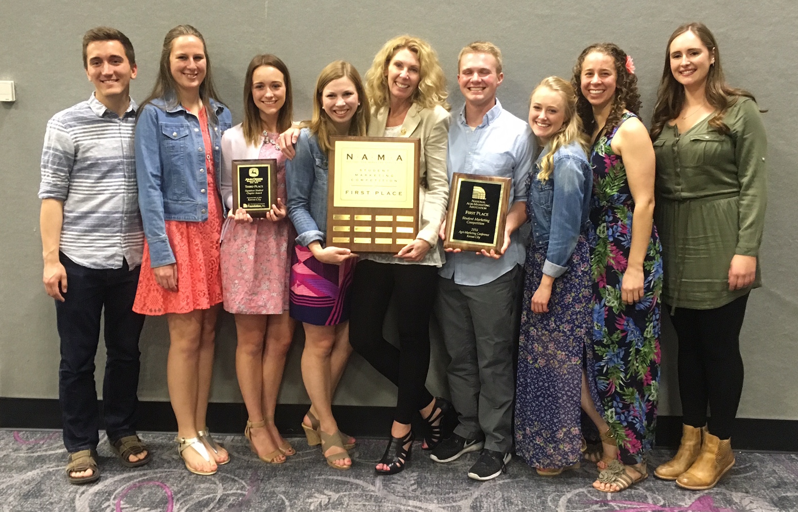 The winning NAMA marketing team from left to right: Jordan Gaal, Erica Ballmer, Jaime Sawle, Kate Griswold, Sarah Fletcher Botham (NAMA advisor), Brandon Maly, Mariah Martin, Sydney Endres and Savannah Waller.