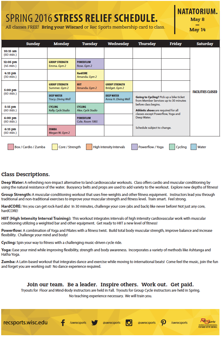 Faculty and staff are welcome to participate in this week’s stress relief classes at the Natatorium, which are being offered to help students make it through finals. For details, download the 2016_spring_Stress Relief_Schedule or view the screenshot below.