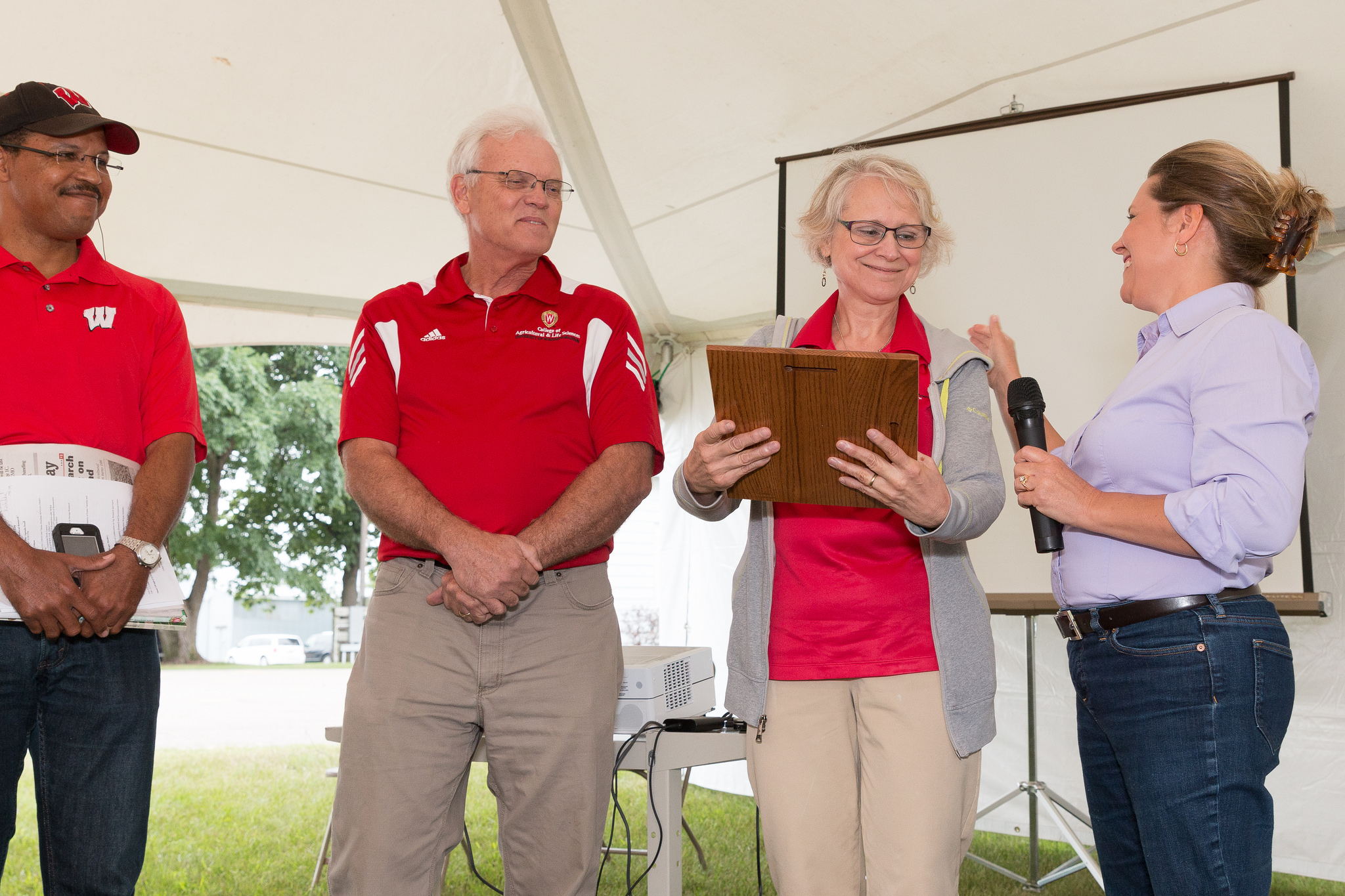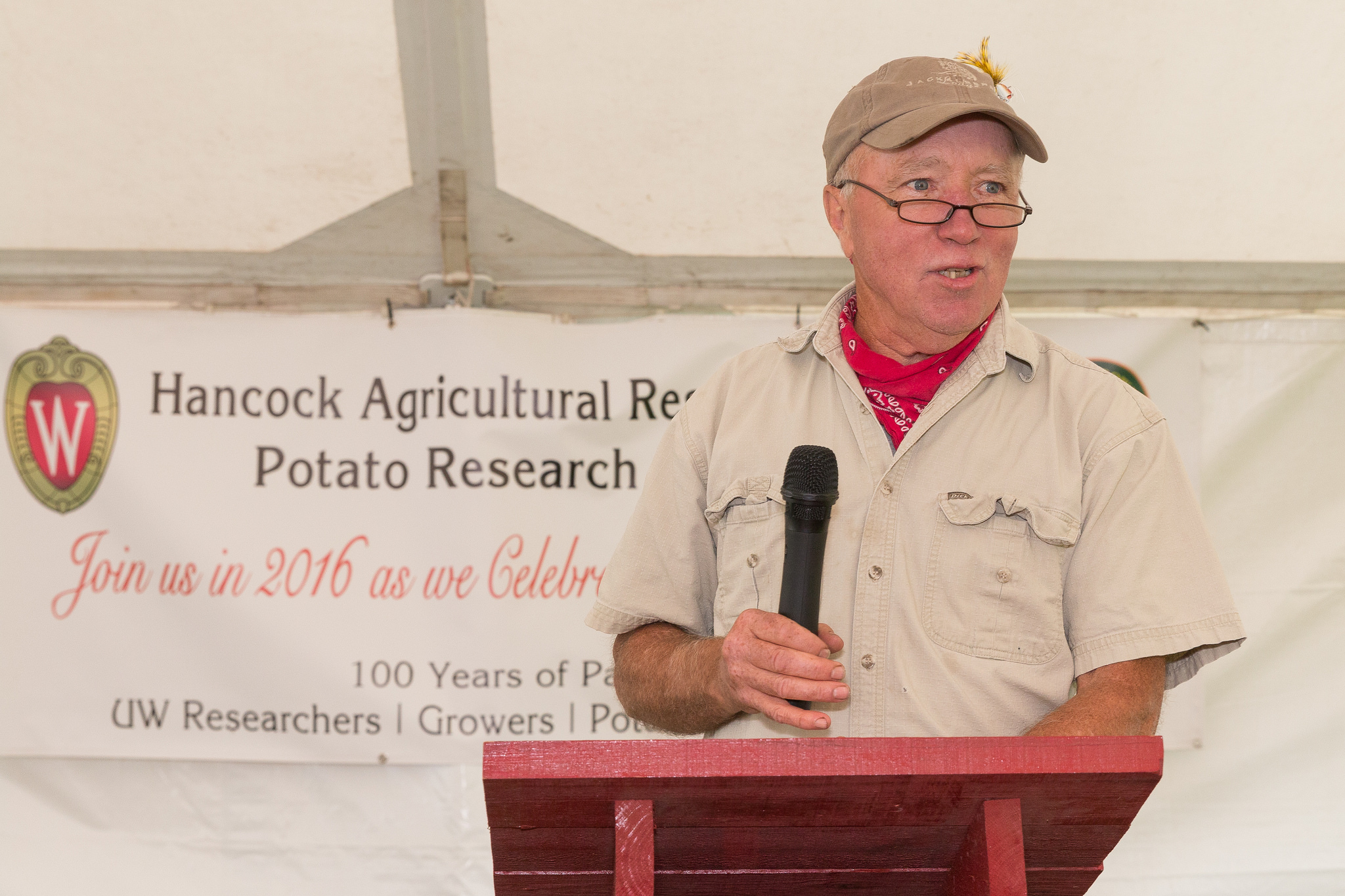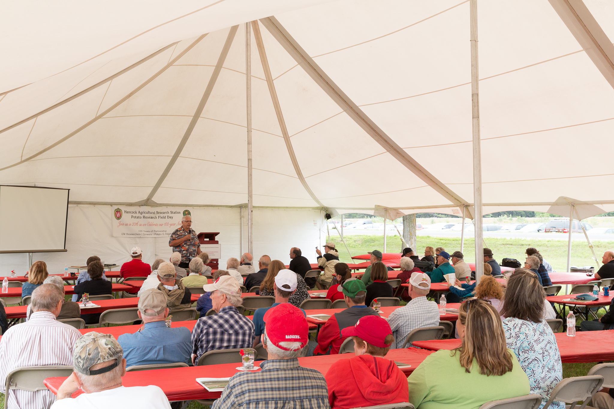 Hancock station’s Sue Reinert welcomed visitors as they arrived at the station. The event was well attended, and the weather cooperated for the most part. Despite being overcast all day, it only rained for 45 minutes or so around lunchtime.During the morning session, speakers – including former Hancock superintendent Chuck Kostichka (pictured here) – gave a nice overview of the station’s history and accomplishments. Other morning speakers included Dean Kate; Stewart Higgins of the Midwest Food Processor Association; Tamas Houlihan of the Wisconsin Potato and Vegetable Growers Association; Felix Navarro; Jeff Wyman; Keith Kelling; Larry Binning; and Russel Groves.Justin Isherwood, a fifth-generation farmer with Isherwood Farm, authored the station’s centennial book, titled “2016 Hancock Agricultural Research Station: Celebrating 100 years of the Wisconsin Idea.”During the morning session, state senator Julie Lassa (far right) presented an official citation in honor of the station’s 100 years of service. Felix Navarro, Dwight Mueller and Dean Kate accepted the honor.Under a gloomy sky, field day participants piled onto the station’s tractor-pulled bleachers for a tour of the station. Field day talks covered research projects on storage; nutrient management; cucumber, snap bean and potato breeding; and disease and insect management.The potato breeding stop on the field day tour. Ahead of dinner, Dean Kate, Wisconsin’s Secretary of Agriculture Ben Brancel and others addressed the crowd. Stewart Higgins of the Midwest Food Processor Association and Tamas Houlihan of the Wisconsin Potato and Vegetable Growers Association expressed their organizations’ ongoing commitment to support station research into the future. (This photo by Nicole Miller/UW-Madison CALS. All others by Sevie Kenyon/UW-Madison CALS.)Meals, provided by the Wisconsin Potato and Vegetable Growers Association, were eaten picnic style on boxes and picnic tables behind the station’s headquarters building. Lunch featured burgers and brats. Dinner was delicious BBQ ribs and chicken.