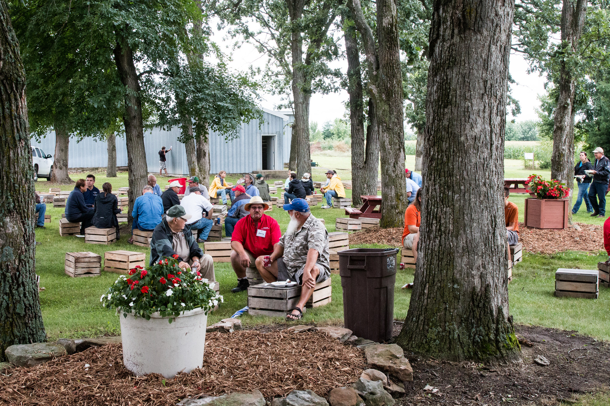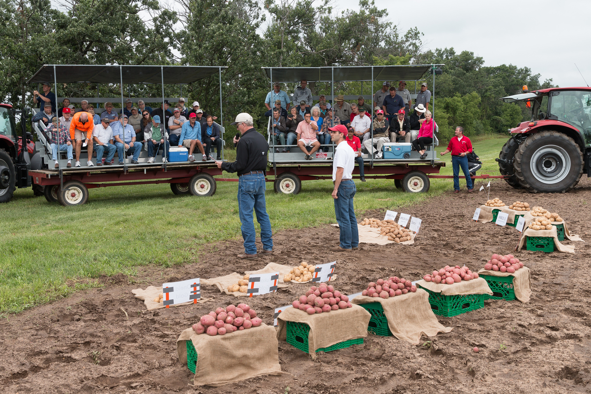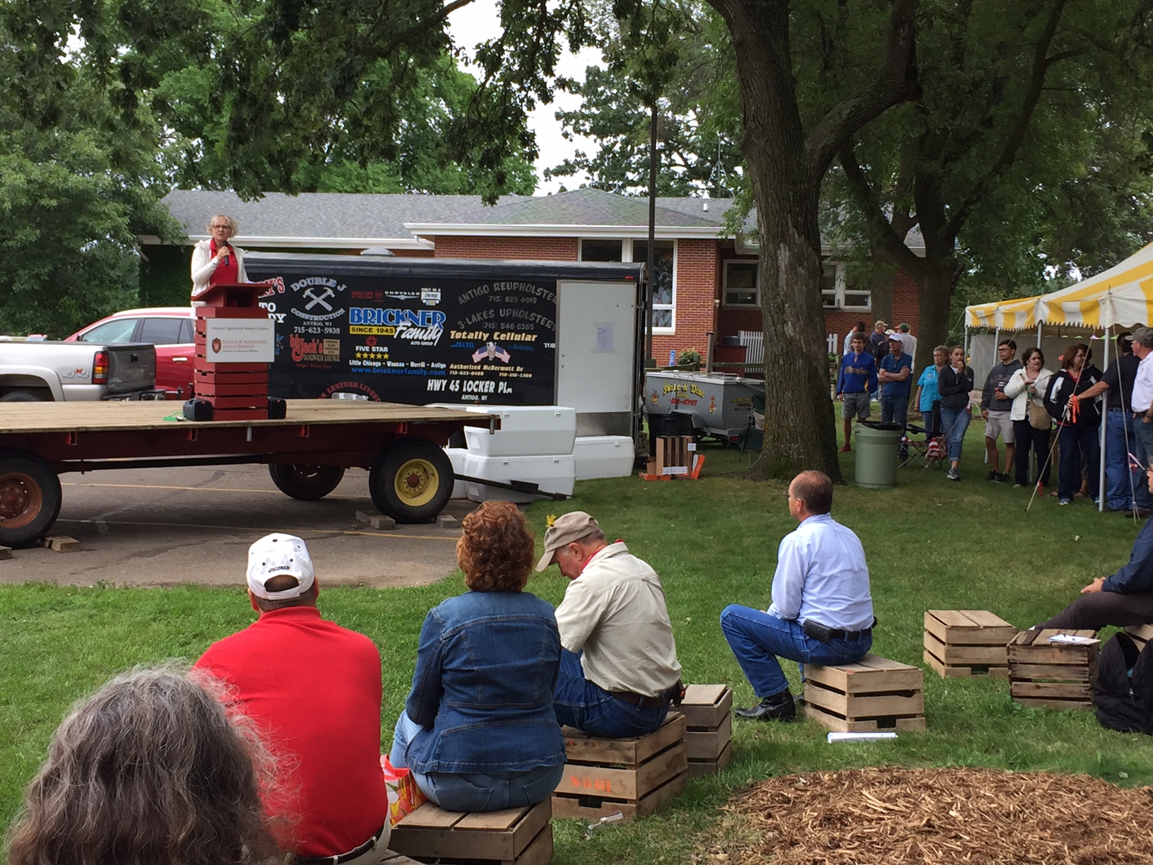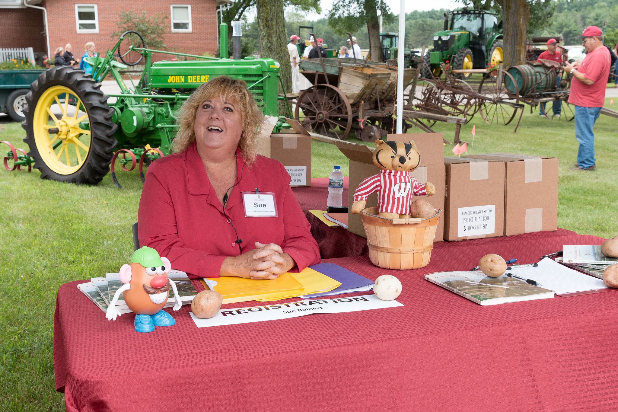 Hancock station’s Sue Reinert welcomed visitors as they arrived at the station. The event was well attended, and the weather cooperated for the most part. Despite being overcast all day, it only rained for 45 minutes or so around lunchtime.During the morning session, speakers – including former Hancock superintendent Chuck Kostichka (pictured here) – gave a nice overview of the station’s history and accomplishments. Other morning speakers included Dean Kate; Stewart Higgins of the Midwest Food Processor Association; Tamas Houlihan of the Wisconsin Potato and Vegetable Growers Association; Felix Navarro; Jeff Wyman; Keith Kelling; Larry Binning; and Russel Groves.Justin Isherwood, a fifth-generation farmer with Isherwood Farm, authored the station’s centennial book, titled “2016 Hancock Agricultural Research Station: Celebrating 100 years of the Wisconsin Idea.”During the morning session, state senator Julie Lassa (far right) presented an official citation in honor of the station’s 100 years of service. Felix Navarro, Dwight Mueller and Dean Kate accepted the honor.Under a gloomy sky, field day participants piled onto the station’s tractor-pulled bleachers for a tour of the station. Field day talks covered research projects on storage; nutrient management; cucumber, snap bean and potato breeding; and disease and insect management.The potato breeding stop on the field day tour. Ahead of dinner, Dean Kate, Wisconsin’s Secretary of Agriculture Ben Brancel and others addressed the crowd. Stewart Higgins of the Midwest Food Processor Association and Tamas Houlihan of the Wisconsin Potato and Vegetable Growers Association expressed their organizations’ ongoing commitment to support station research into the future. (This photo by Nicole Miller/UW-Madison CALS. All others by Sevie Kenyon/UW-Madison CALS.)Meals, provided by the Wisconsin Potato and Vegetable Growers Association, were eaten picnic style on boxes and picnic tables behind the station’s headquarters building. Lunch featured burgers and brats. Dinner was delicious BBQ ribs and chicken.