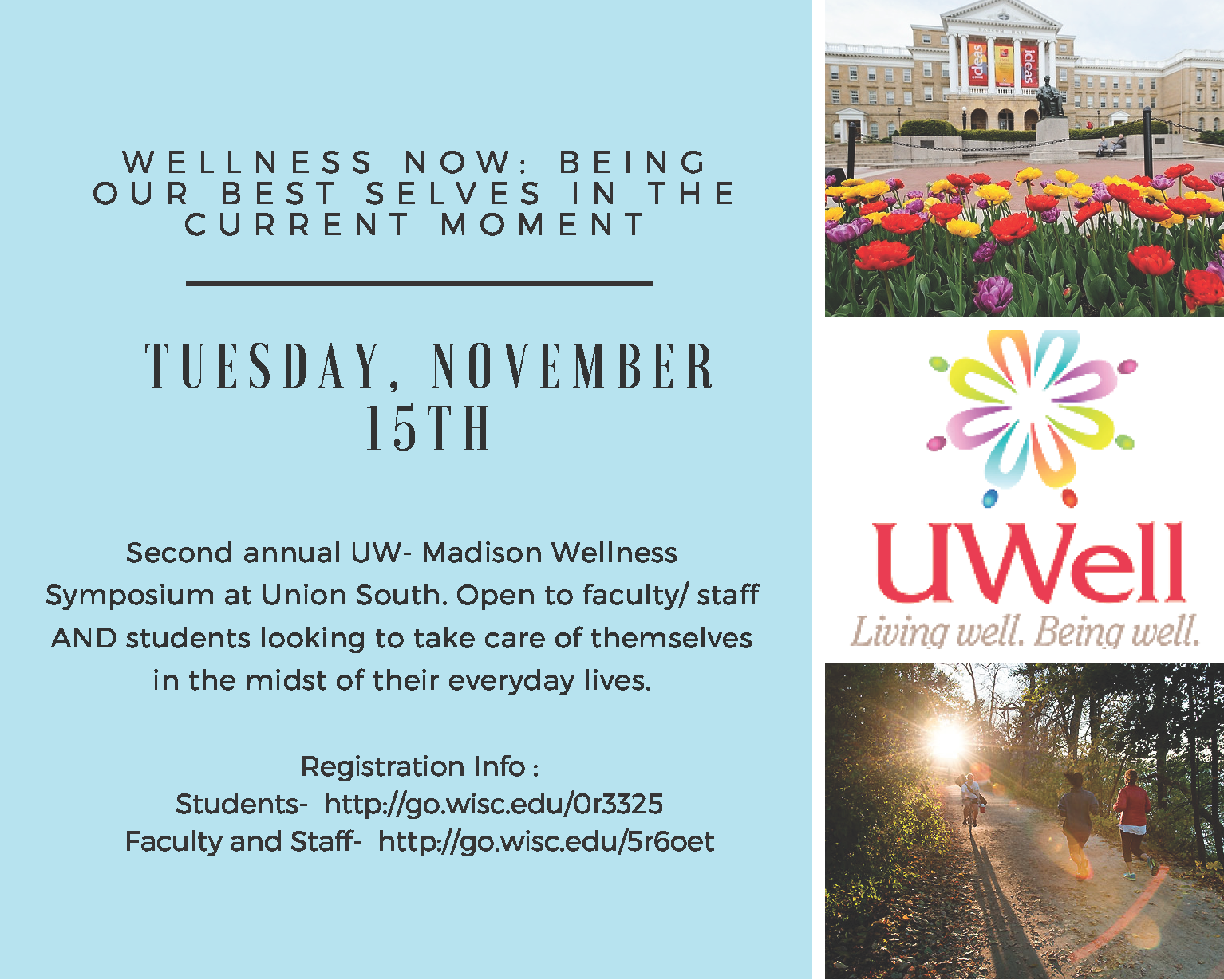Faculty and staff are encouraged to attend the second annual UW-Madison Wellness Symposium on Tues., Nov. 15 at Union South. The registration fee for faculty and staff is $20.