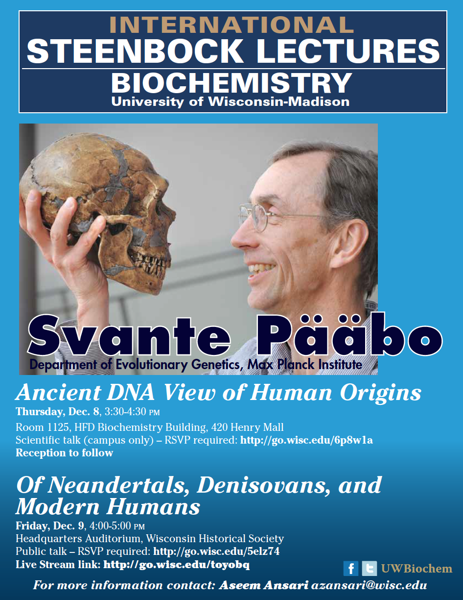 Pääbo’s talks are part of the Biochemistry Colloquium’s International Steenbock Lectureship, funded by the Harry Steenbock Lectureship in Biochemistry and Life Sciences. Harry Steenbock was a highly regarded biochemistry professor who discovered the irradiation process for producing vitamin D.