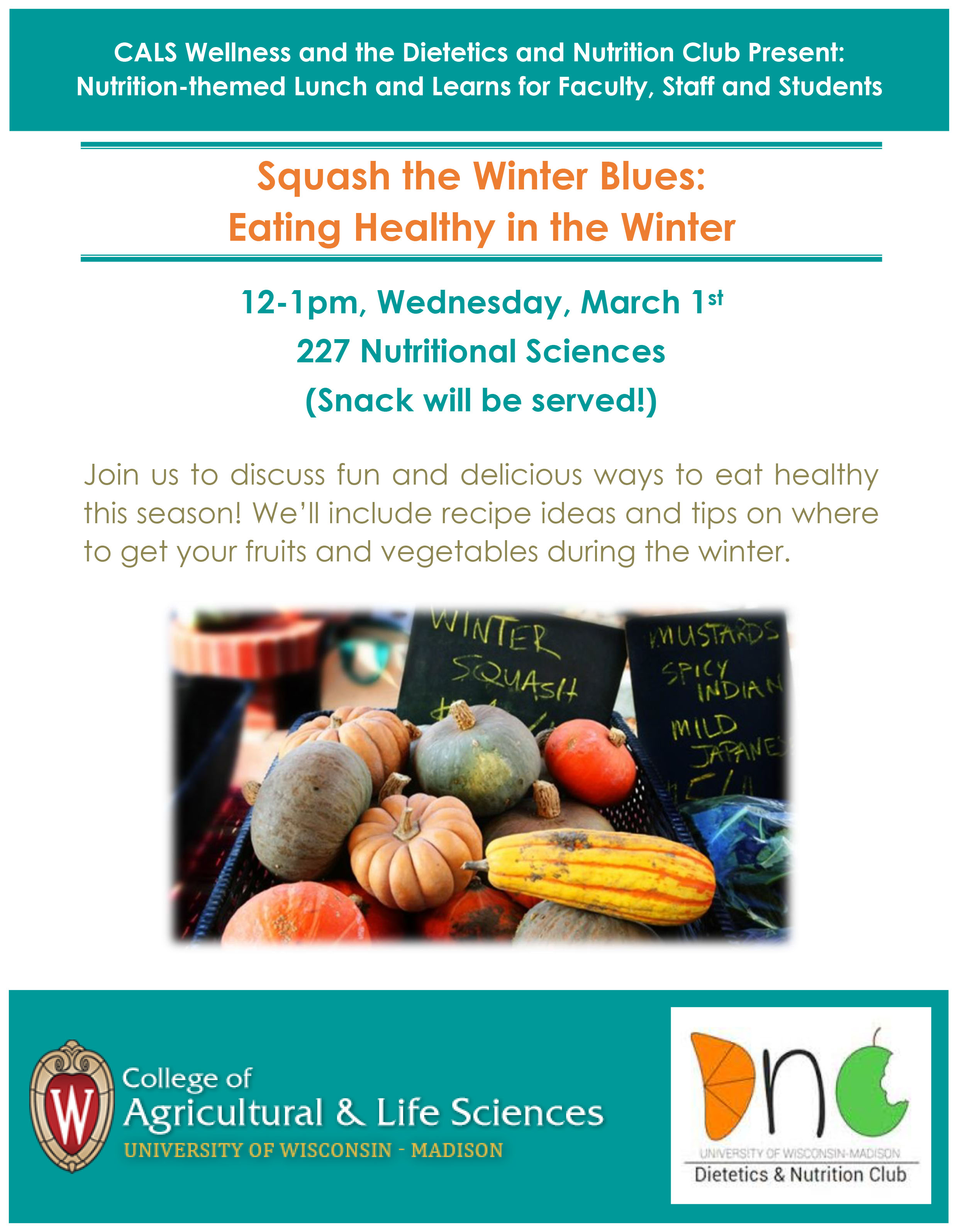 The topic will be “Squash the Winter Blues: Eating Healthy in the Winter” and will be held noon – 1 p.m. on Wednesday, March 1 in 227 Nutritional Sciences. Snacks will be served.