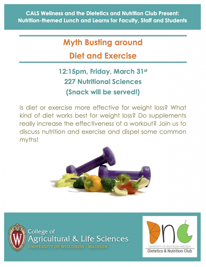 Reminder: Lunch and Learn – Myth busting around diet and exercise March 31 March 27, 2017 | By CALS Wellness Committee
