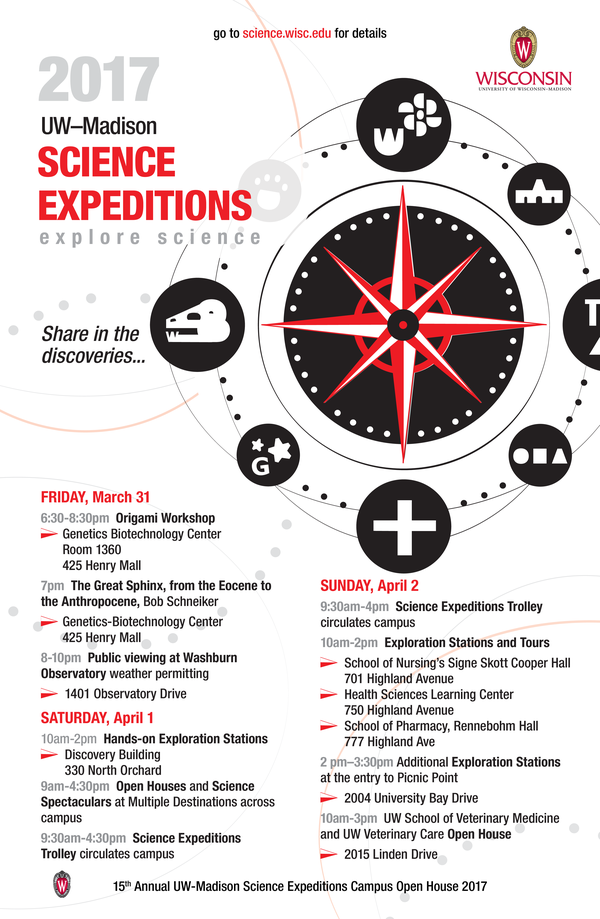 UW-Madison Science Expeditions runs Friday through Sunday this weekend, March 31 – April 2. This annual campus science open house is family-friendly, with activities for all ages. Please visit the Science Expeditions website for information about specific events and their locations/times.