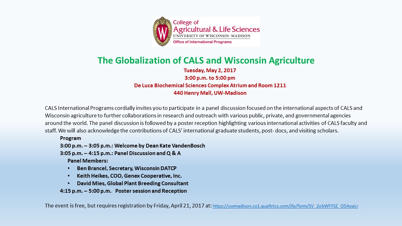 International Programs (IP) of the College of Agricultural and Life Sciences (CALS) at the University of Wisconsin-Madison would like to invite CALS faculty, staff and students to its spring event: The Globalization of CALS and Wisconsin Agriculture on Tuesday, May 2, 2017.