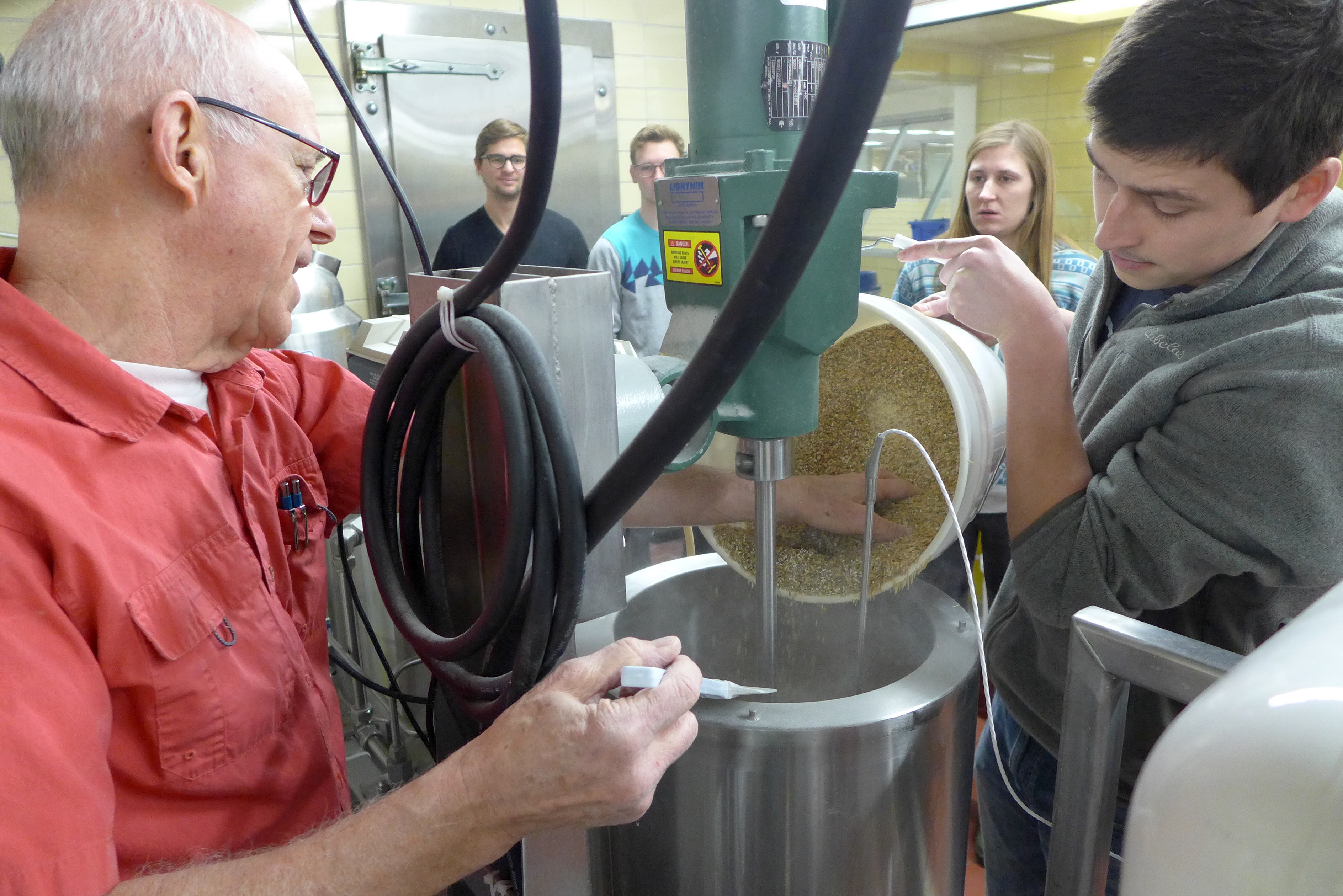 As water and malted barley were cooked in a container called a mash tun, sugar was extracted from the malt, instructor Hans Zoerb says. “It’s like steeping tea leaves in hot water to get out the flavors.” Zoerb, who worked as a protein chemist at Pillsbury and Cargill in Minnesota, taught the brewing class in conjunction with James Steele, a professor of food science.