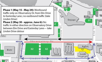 Elm Drive to Easterday Lane will allow westbound traffic only. Eastbound traffic will be detoured onto Linden Drive. Between May 29 and approximately June 6, no traffic will be allowed in either direction between Elm and Easterday, and all traffic will be directed onto Linden.