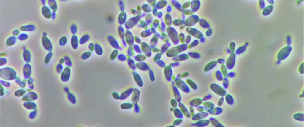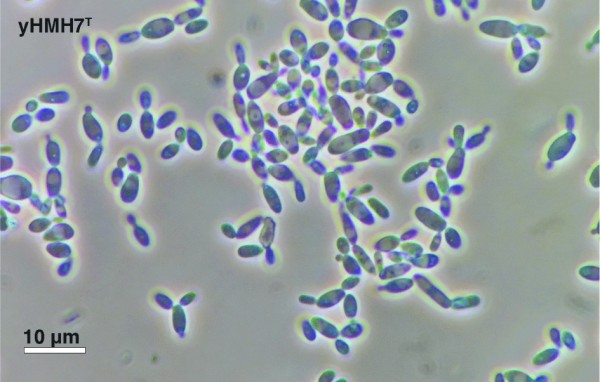 Budding cells of Yamadazyma laniorum, a previously unknown species of yeast found by recent UW–Madison grad Max Haase just a short walk from his Green Bay, Wisconsin, backyard.