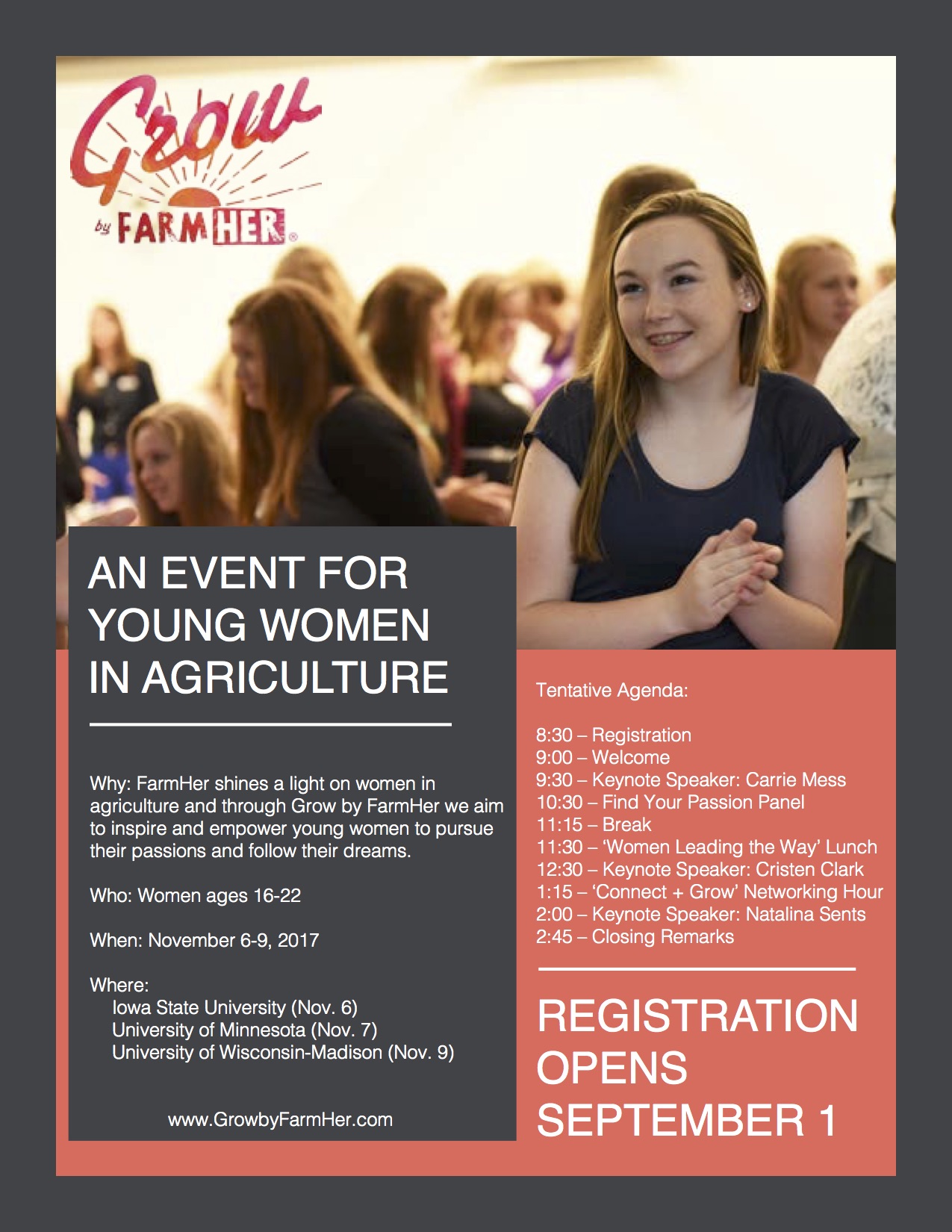 More details are in the flyer below. Visit the Grow by FarmHer website for more information and to register. For any questions about registration, please contact Lexi Marek at lexi@farmher.com.