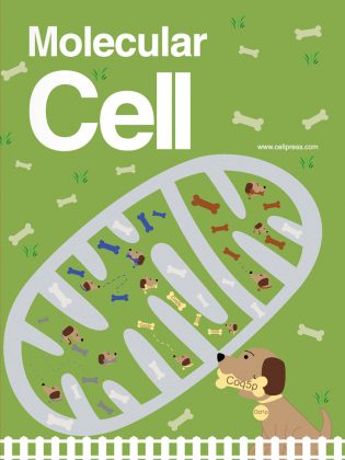 This cover art depicts, like a dog searching for buried bones, a certain protease that “chews up” damaged proteins in the mitochondria. Scientists know very little about its purpose in the electron transport chain that creates cellular energy.