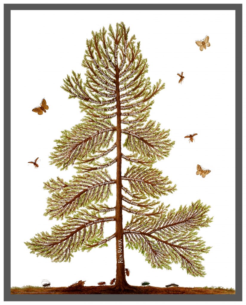 At the ceremony, Raffa was presented with an “academic family tree” by his colleagues. The illustration, created by Jacki Whisenant, showcases the graduate students who were trained in Raffa’s lab, with their names in chronological order in the tree’s main branches, with the earliest students at the base of the tree. Raffa’s former postdoctoral associates are indicated by drawings of the insects that they focused on. The gift was borne from an idea developed by Nathan Havill, Rich Hoffstetter and Kimberly Wallin, all former students of Raffa.