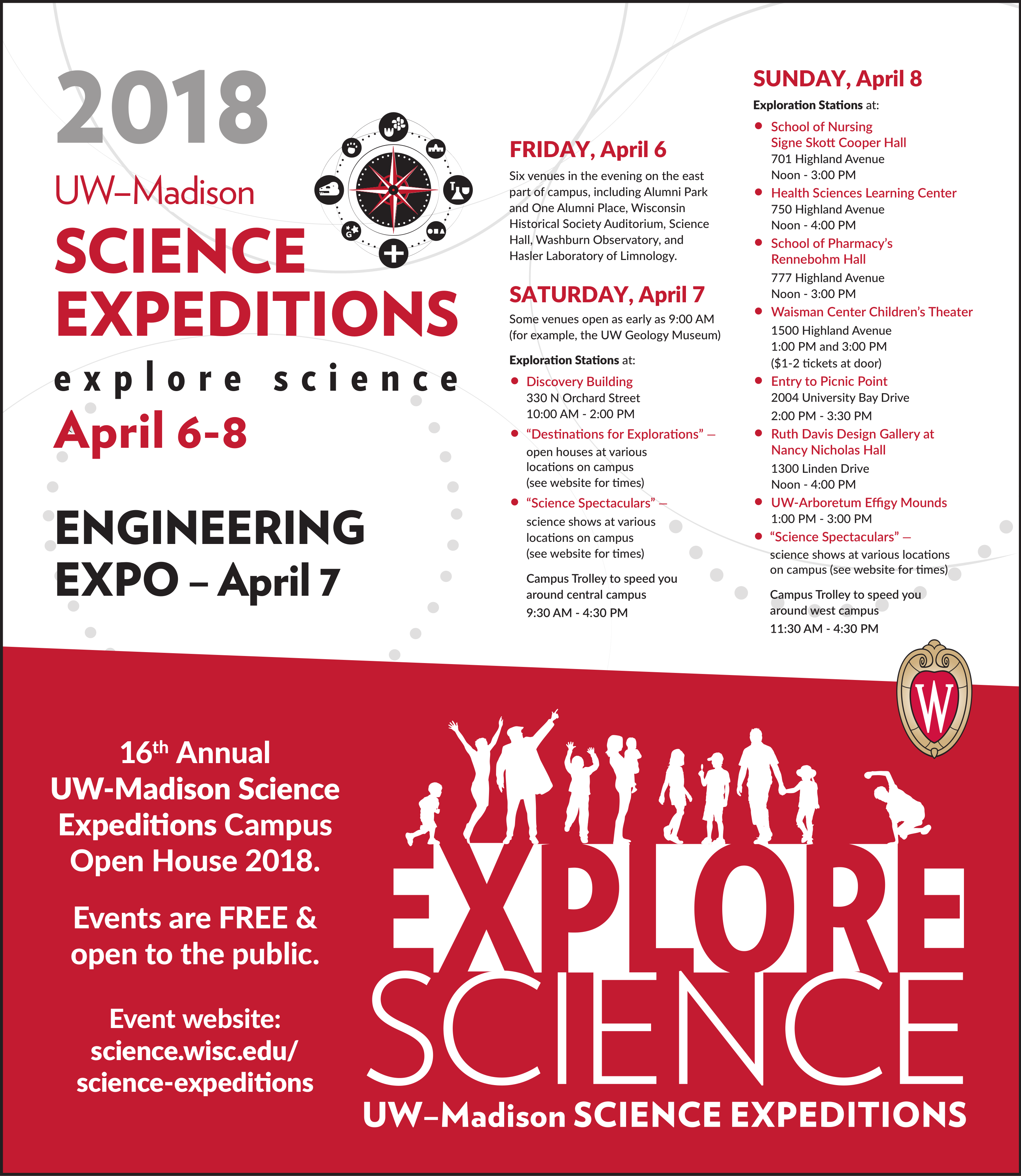 The UW–Madison Science Expeditions runs Friday through Sunday this weekend, April 6 – 8. This annual campus science open house is family-friendly, with activities for all ages. Please visit the Science Expeditions website for information about specific events and their locations/times.
