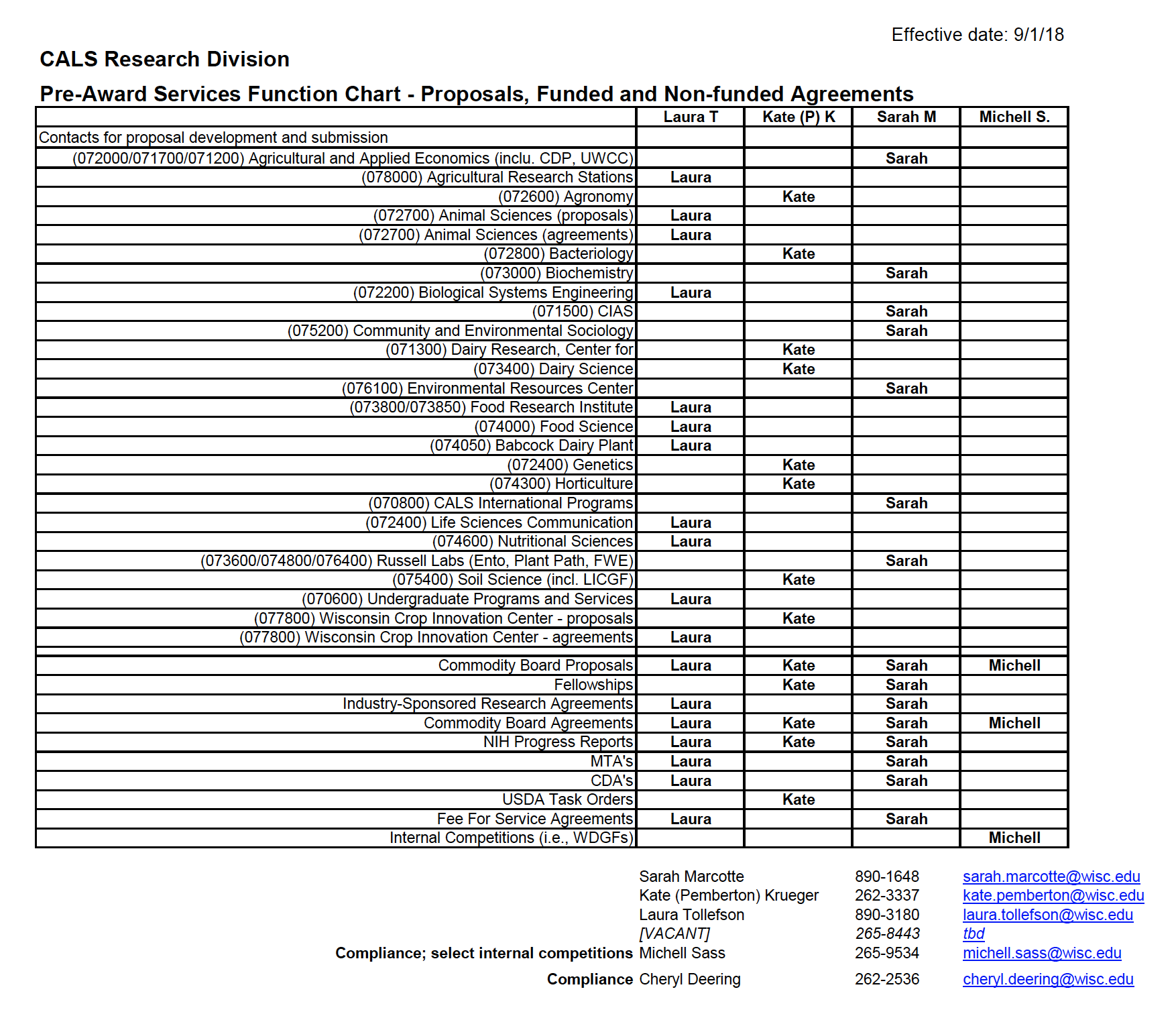 The CALS Research Division is in the midst of filling a vacancy. To ensure coverage during this time of transition, some changes have been made to departmental contacts for pre-award matters. These transitional assignments will be revisited after the vacancy is filled. See the Pre-Award Services Function Chart below or download the pre-award contacts document.