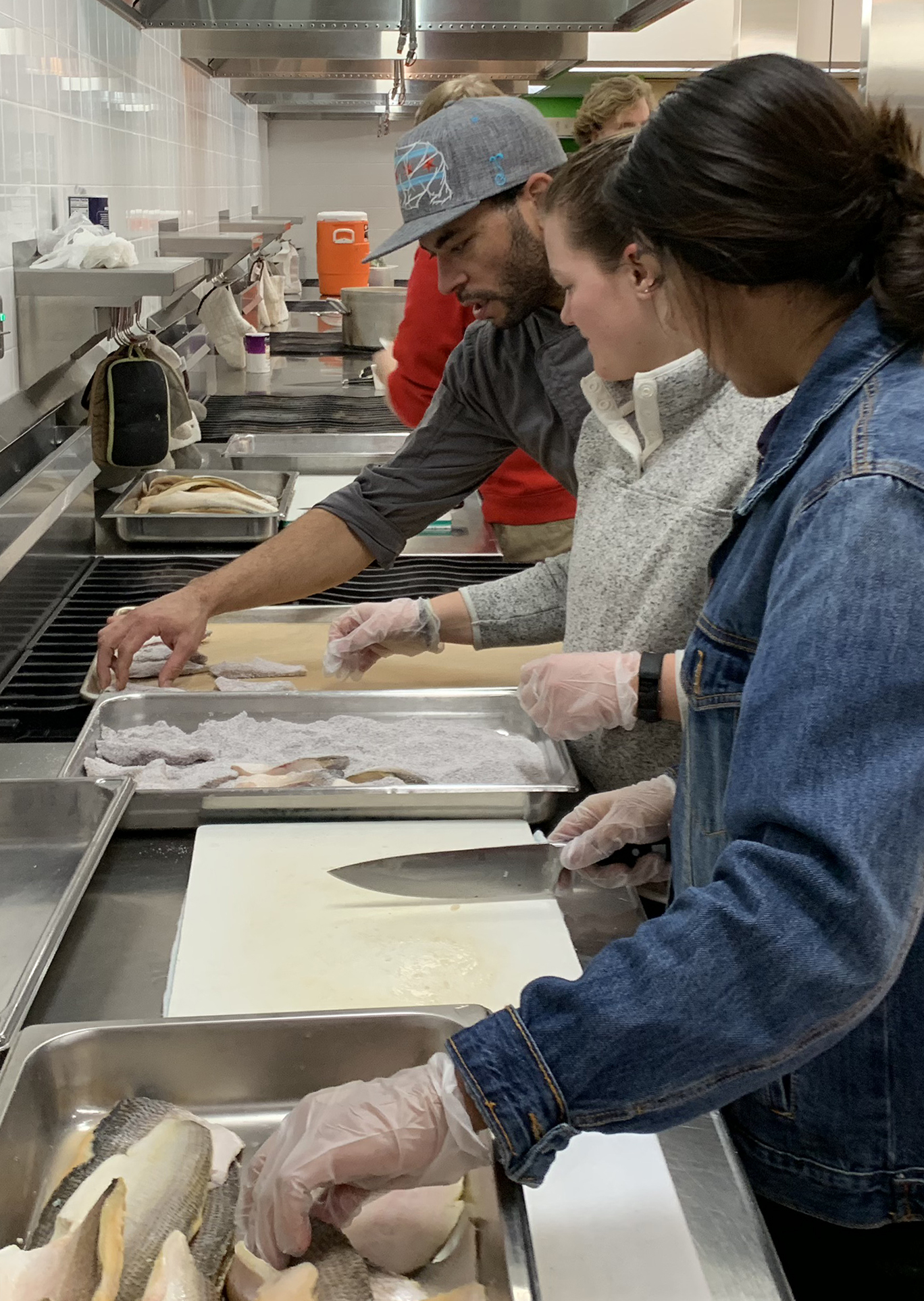 Dan Cornelius, technical assistance specialist with the Intertribal Agriculture Council and member of the Oneida Nation, described how various types of hominy are prepared. Hominy is one of the “Three Sisters” – corn, beans and squash – that are traditionally grown together. Eaten as a trio, they provide the nutrition needed for Native American peoples to thrive on a mostly plant-based diet.Chef Elena Terry (center), owner of Wild Bearies catering and member of the Ho Chunk Nation, demonstrated how to prepare and roast squash, which was later pureed and used as a topping on two types of pudding: hominy pudding and wild rice pudding.Yusuf Bin-Rella, chef at UW-Madison’s Dejope Residence Hall, showed food science students how to cut, coat (with ground hominy) and bake whitefish. Bin-Rella is also the co-founder of TradeRoots Culinary Collective, an organization that seeks to raise the profile of soul food and the cuisine of the African diaspora in Madison.Attendees tried their hand at grinding hominy using traditional Native tools. A handful of hominy turned to powder with just a few taps.Dinner is served! Attendees filled their plates with the various dishes they learned about and helped to prepare. Dishes included (approximately left to right) a colorful “Three Sisters Salad” with beans, squash, hominy and additional vegetables; various types of cooked hominy; candied hominy that had been sweetened with maple syrup and then roasted; wild rice pudding and (blue-colored) hominy pudding that were topped with frosting and squash puree; and baked whitefish that had been coated in ground hominy.