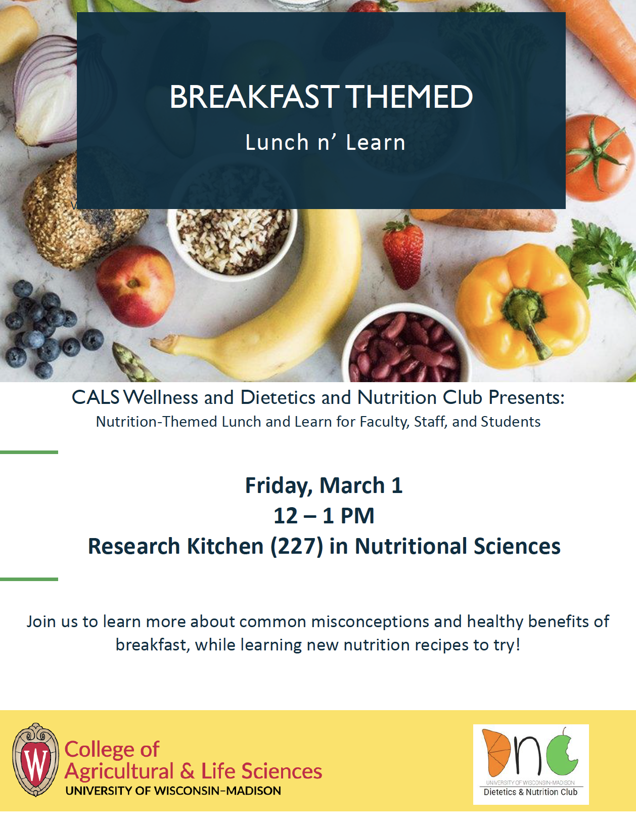 The CALS community is invited to attend the upcoming nutrition-themed lunch and learn event hosted by the CALS Wellness Committee and the Dietetics and Nutrition Club. Attendees will learn about common misconceptions about breakfast, the health benefits associated with consuming breakfast, as well as some new recipes to try!