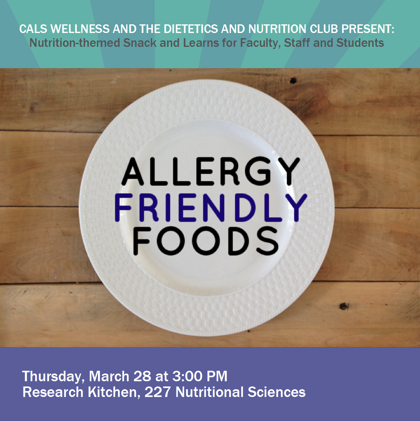 The CALS community is invited to attend the upcoming nutrition-themed snack and learn event hosted by the CALS Wellness Committee and the Dietetics and Nutrition Club. Attendees will learn about food allergies, how to prepare allergy-friendly foods, and fun allergy-friendly recipes!