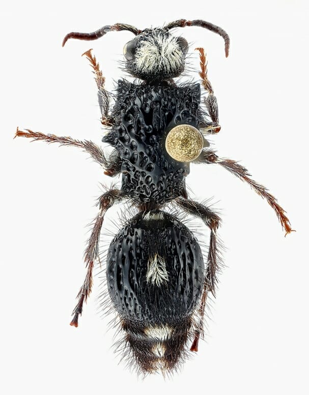 Bothriomutilla rugicollis may be an Australian wasp, but members of its family — the Mutillids — are commonly called velvet ants. During their larval development, they live inside an insect host. The moon-like object hovering above this female’s thorax is the head of the pin holding this curated specimen.