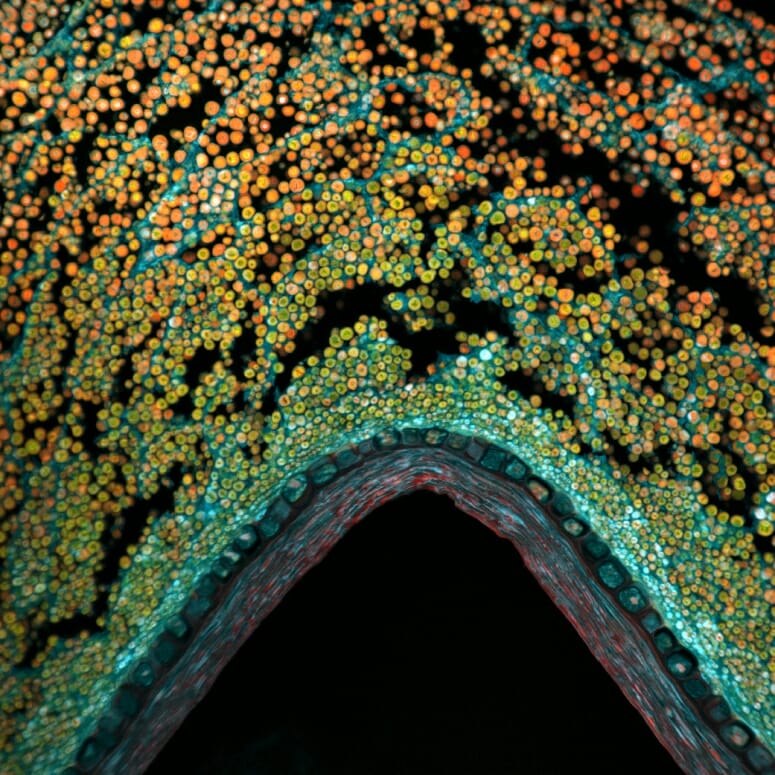 In cross-section, a single grain of corn becomes remarkably complex. The germ — the living base of a kernel where the plant’s genetic information resides, pictured here — includes the coleoptile, a sheath that protects an emerging shoot and the first leaves.
