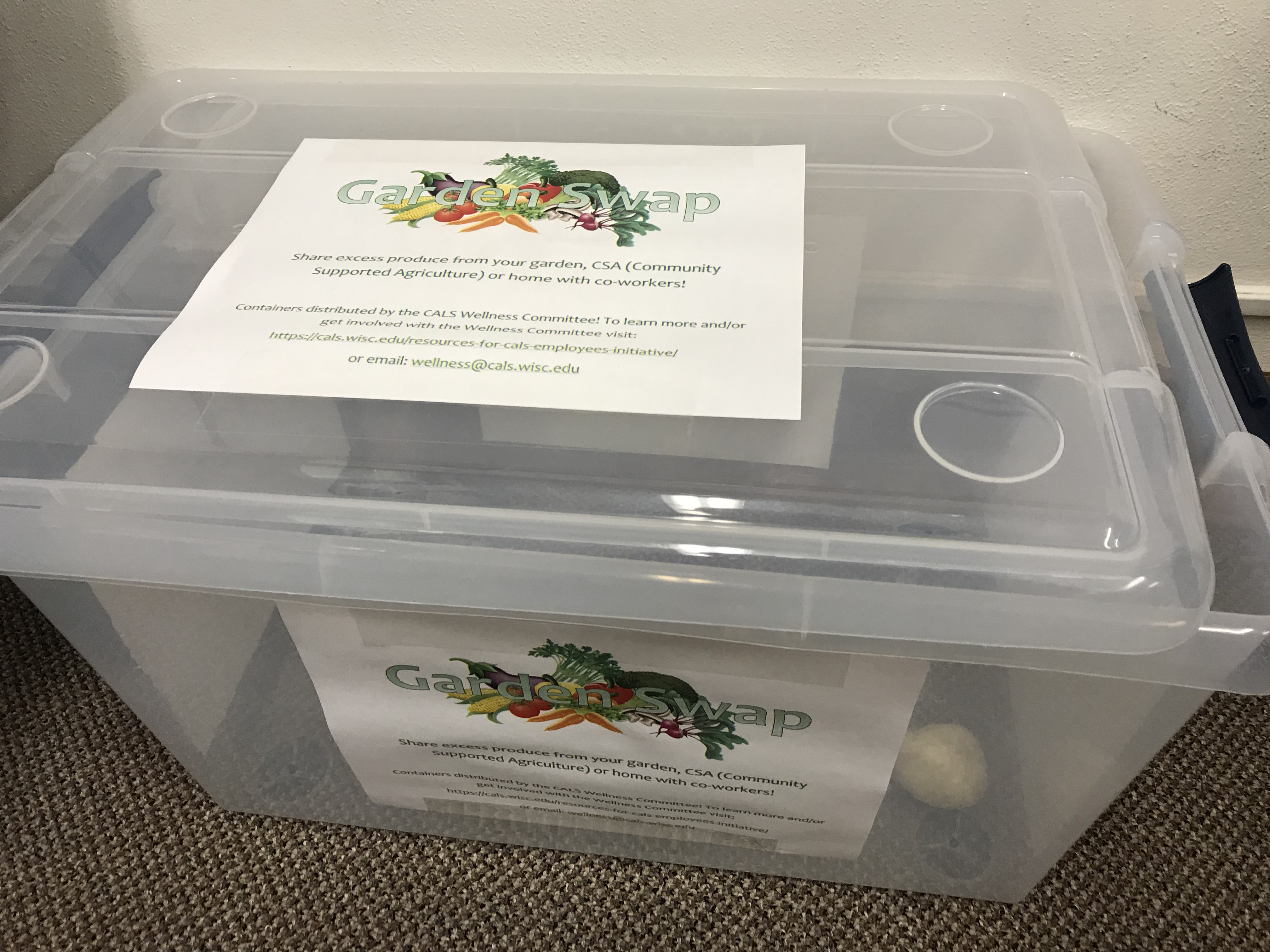 In May we wrote an article about offering garden swap bins to CALS departments and centers. Garden swap bins allow staff to share excess produce from their garden or their CSA (community supported agriculture) with others in their office, department and building. Bins are now located in Ag and Applied Economics, Biochemistry, Human Resources, Nutritional Sciences, Russell Labs, and Soil Science.