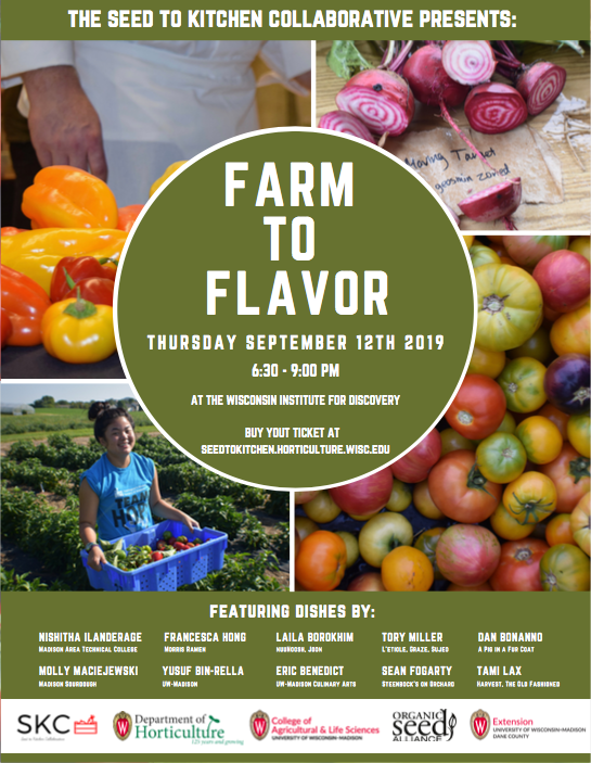 Food lovers interested in how great seeds turn into great meals are invited to join the Seed to Kitchen Collaborative at their fifth annual “Farm to Flavor” event on September 12, 6:30 to 9 p.m. The dinner, which will take place at the Discovery Building on the UW–Madison campus, is an unconventional tasting event celebrating biodiversity in food through small-plate dishes from Madison’s talented chefs.