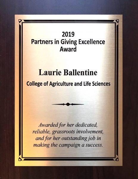 Laurie Ballentine, the Partners in Giving coordinator for Entomology, Forest and Wildlife Ecology, Plant Pathology and the Russell Labs Hub, was awarded one of the Partners in Giving Excellence Awards at a ceremony on March 10. Only four recipients among State of Wisconsin and UW were selected.