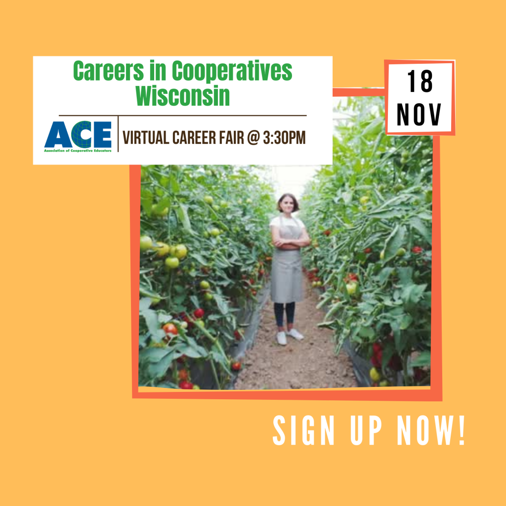 Join ACE on November 18th, 2020 @3:30pm for a virtual career fair with cooperative employers and researchers such as Land O’ Lakes Inc., 40 Square Cooperative, Landmark Cooperative, Equity Cooperative and the Wisconsin Farmers Union.