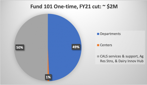 The total one-time cut to CALS in the current fiscal year is $2.06 million. Although departments and centers account for 75% of the overall CALS 101 budget, they will be apportioned 50% of this cut. Each department/center’s cut will be based on their current proportion of 101 funding. The additional 50% will come from college-wide services and programs. These targets must be met through 101 salary savings. (101 supply and expense savings cannot be used to meet the reductions.)