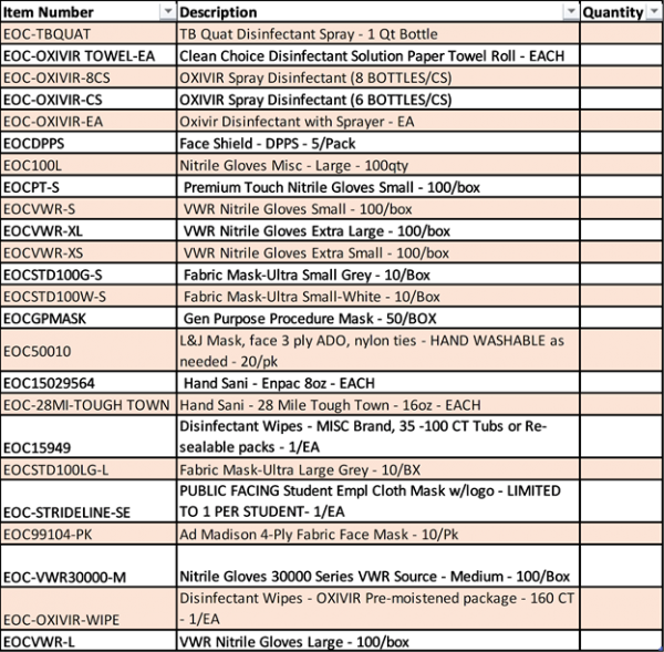 Important note: This process should only be used to order PPE and supplies related to COVID-19 prevention. PPE and cleaning supplies that labs and offices use as part of their normal operations should be purchased per usual. Normal methods may also be used to purchase COVID-19-related PPE and supplies that are not available through this process.