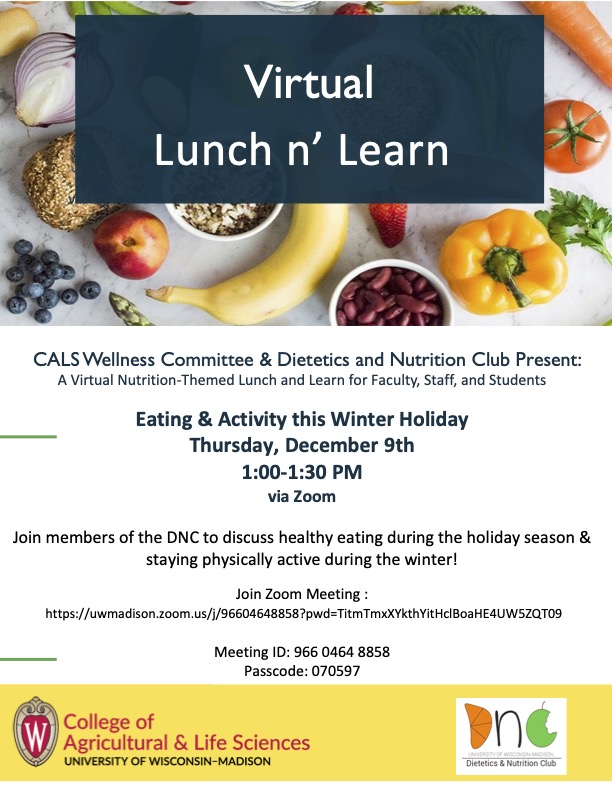 Please come join the Dietetics and Nutrition club for a Lunch n’ Learn on Thursday, December 9th from 1:00-1:30pm. We will be discussing healthy eating during the holiday season and staying physically active during the winter! Timely topics for this time of year. Hope to see you there!