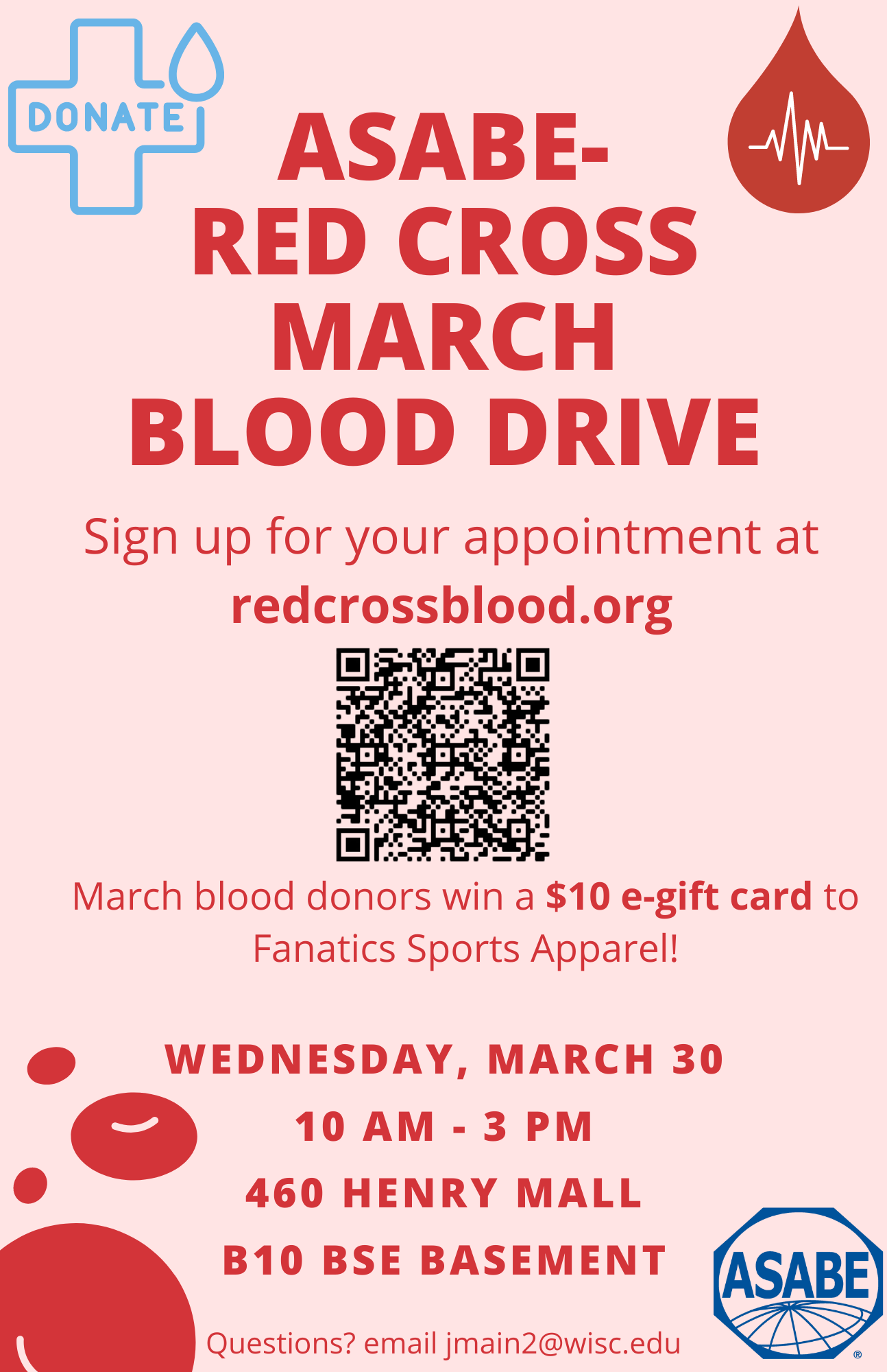 Looking for an opportunity to give blood? The UW–Madison chapter of the American Society of Agricultural and Biological Engineers (ASABE) will be hosting a blood drive on Mar. 30. The drive, held in partnership with the Red Cross, will take place from 10:00 a.m. to 3:00 p.m. that day in the “BSE basement,” room B1 of the Agricultural Engineering Building (located at 460 Henry Mall).