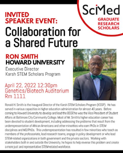 The SciMed Graduate Research Scholars (SciMedGRS) program will host Ron Smith, the executive director of Howard University’s Karsh STEM Scholars Program, on April 22, 2022 at 12:30 p.m. in the Genetics Biotech auditorium (Room 1111), 425 Henry Mall. Smith will speak about “Collaboration for a Shared Future.”